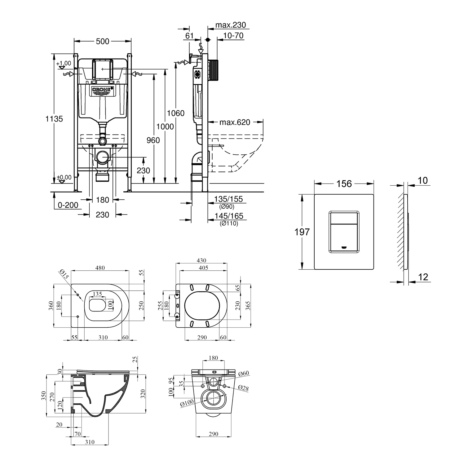 Характеристики Комплект 4 в 1: Установка Grohe Solido 2 в 1 38971000 + Панель смыва для унитаза Grohe Even Black 38966KV0 + Унитаз безобедочный Kroner Harz WHI483632 TORNADO с сиденьем Slim Duroplast / Soft-close2 (38971966KV0KH48T) код товару CV036754