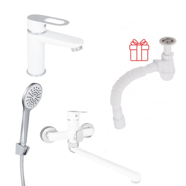 - Смеситель для раковины (LDLAT001WHI45423), смеситель для ванны (LDLAT005WHI45425), сифон (LU01)