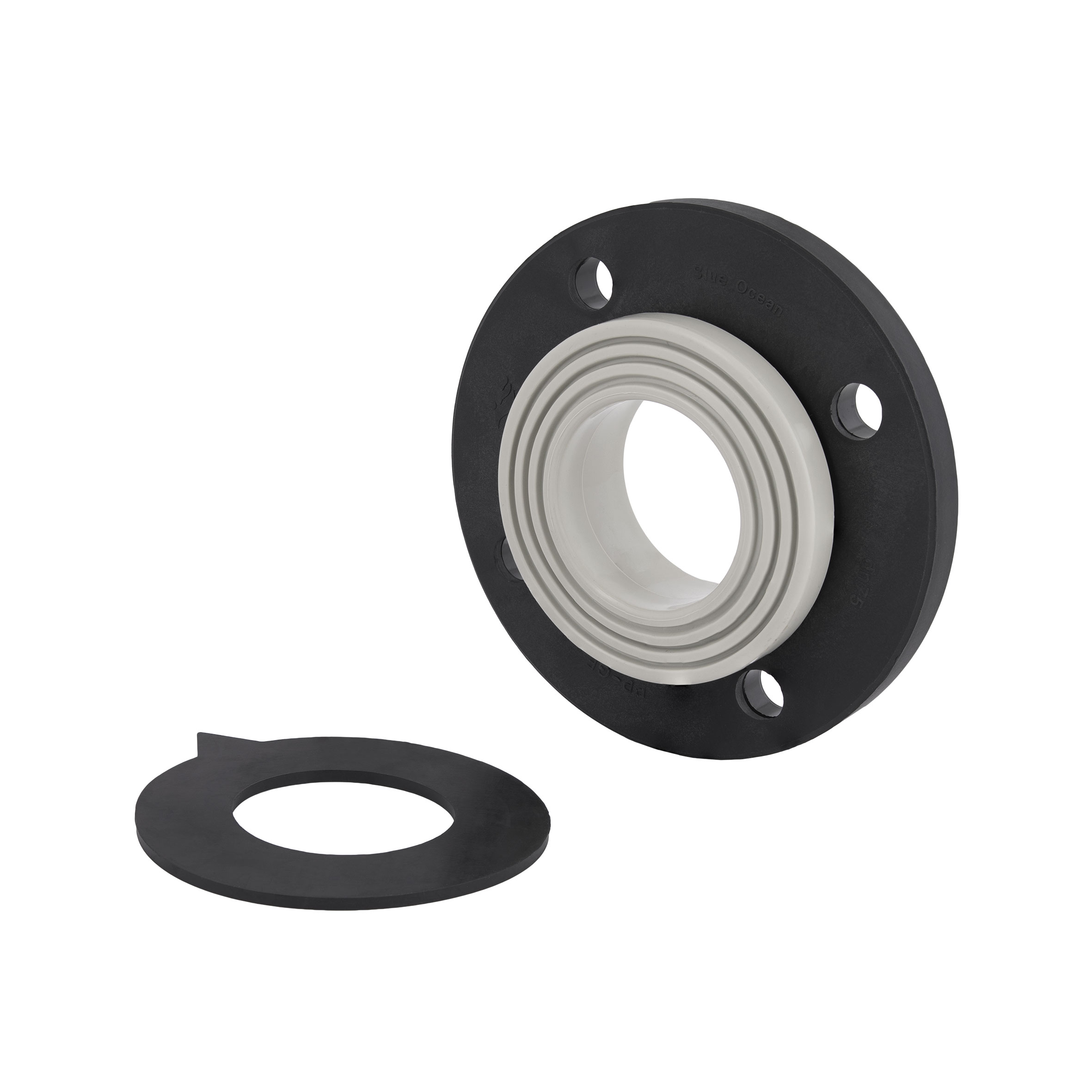 Комплект фланцевого соединения Blue Ocean 75 состоит из трех элементов: втулки, фланца и силиконовой прокладки. Втулка выполнена из полипропилена с буртом, в который упирается фланец. Фланец выполнен из стали с покрытием Fiber-G и четырьмя отверстиями для соединения. Он надевается на втулку с тыльной стороны, после чего втулку приваривают к трубе или запорной арматуре. Такое соединение гарантирует герметичность стыка и долговечность трубопровода.