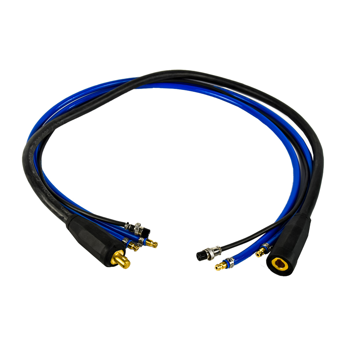 Комплект кабелів комунікації призначений для з'єднання джерела зварювального струму з блоком подачі дроту з можливістю водяного охолодження. Довжина комплекту кабелів комунікації безпосередньо впливає на максимальну відстань, на яку можна віддалити блок подачі дроту від джерела зварювального струму для виконання робочих завдань з напівавтоматичного зварювання.