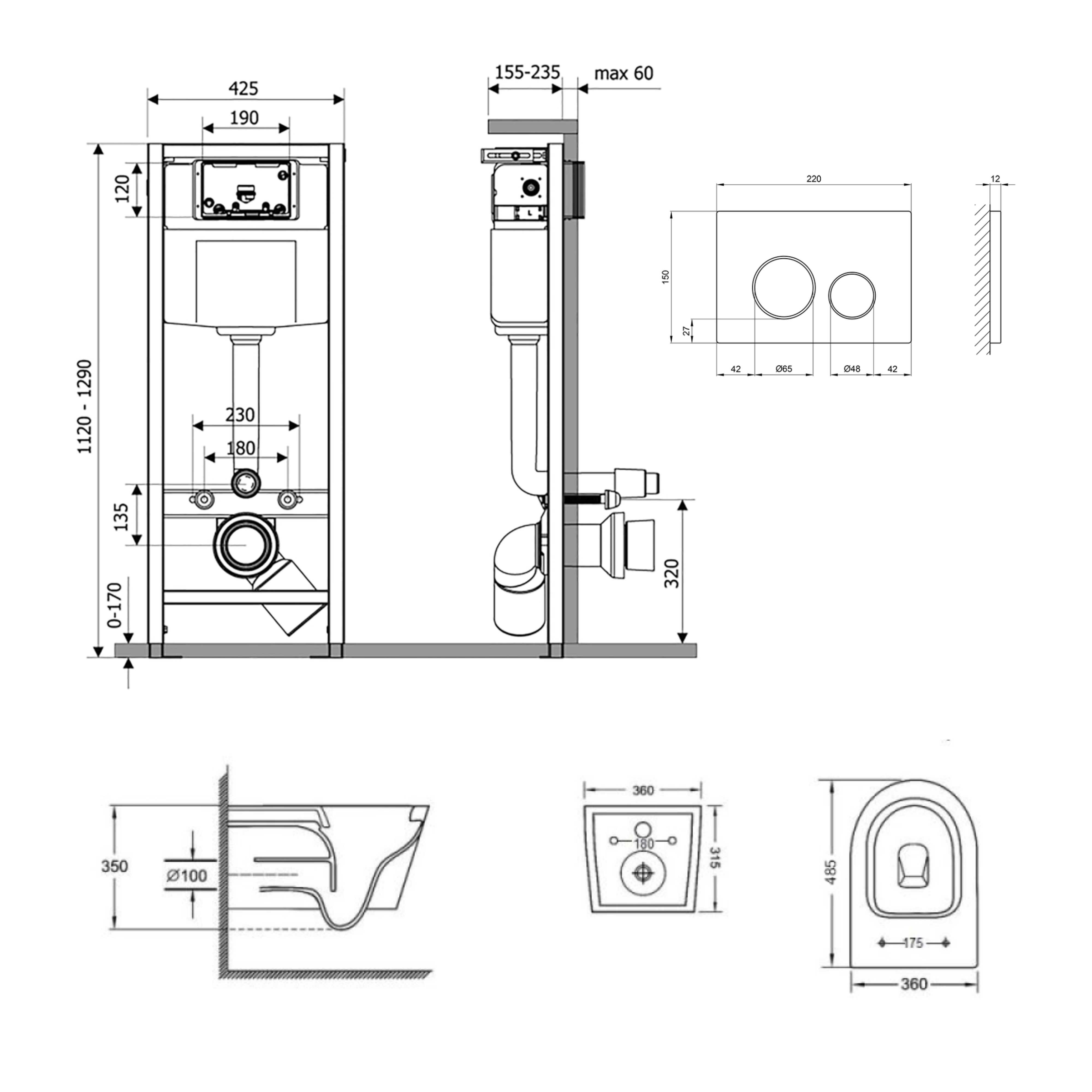 - Унитаз: 350х360х520. Сиденье для унитаза: 35х367х455. Инсталляция: 1280х425х185. Панель смыва: 150х220х30.