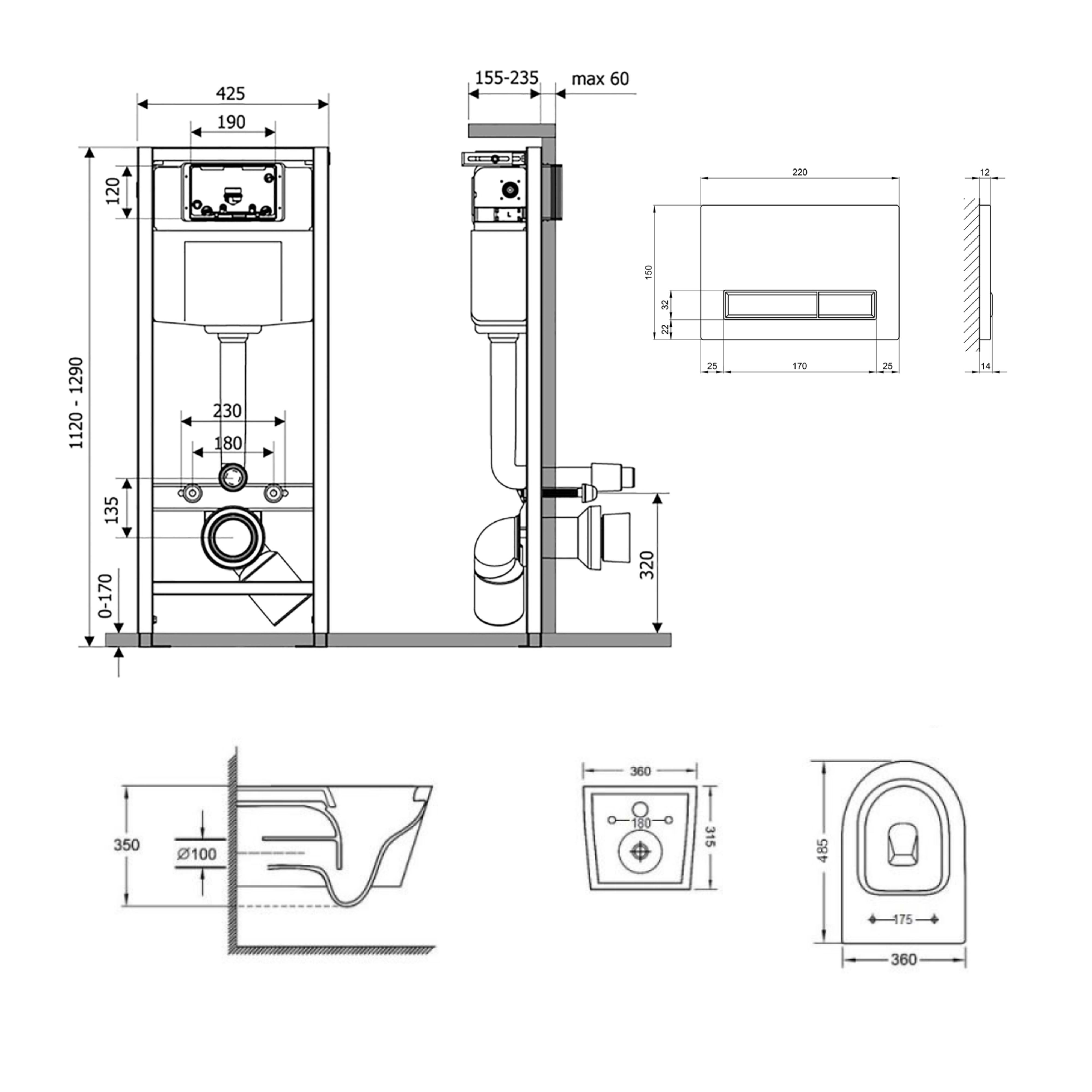- Унитаз: 350х360х520. Сиденье для унитаза: 35х367х455. Инсталляция: 1280х425х185. Панель смыва: 150х220х32.