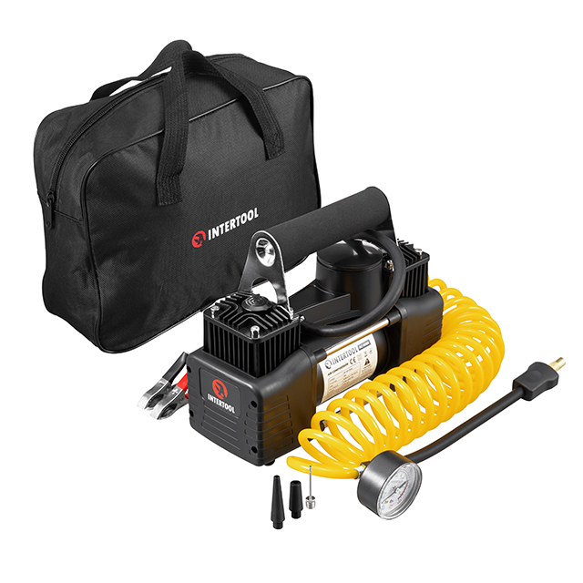 Компресор автомобільний 12 В, 25 А, циліндр 2х30 мм, макс. 10 бар, шланг 0.25*2 м + PU 4.5 м, кабель живлення 3 м