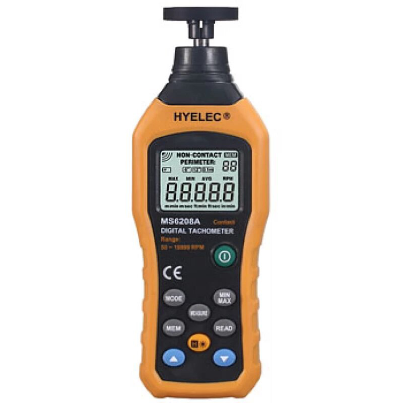 MS6208A (PM6208A) тахометр контактний виробництва компанії Hyelec , призначений для виконання вимірювання швидкості обертання контактним способом. Тахометр реалізує функції утримання максимального, мінімального та поточного виміряних значень. Пам'ять тахометра MS6208A розрахована для зберігання до 100 результатів вимірювань. Живлення MS6208A здійснюється від батарей 4 х 1,5В (ААА), для економії заряду реалізована функція автовимкнення.ОСОБЛИВОСТІ тахометра MS6208A: