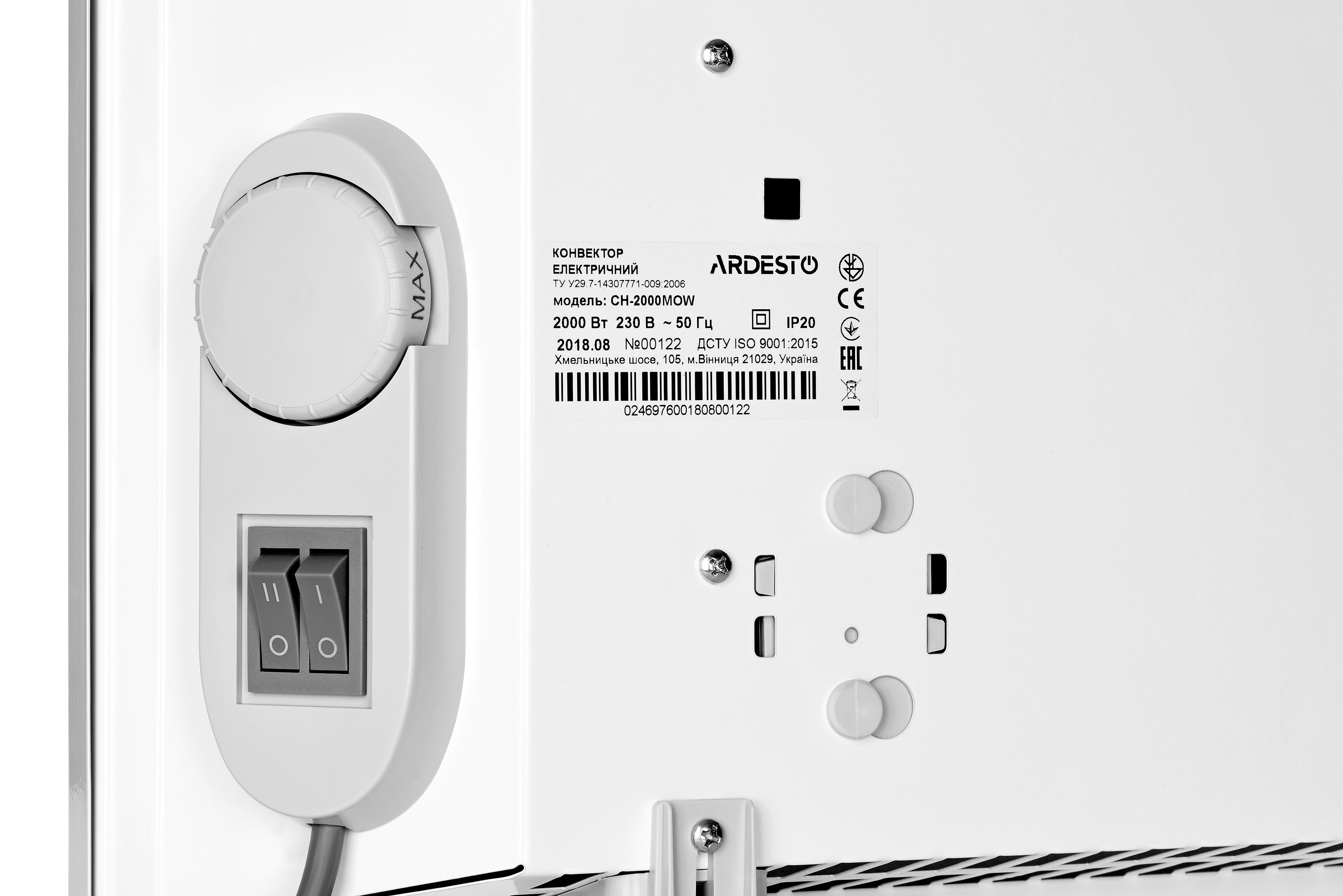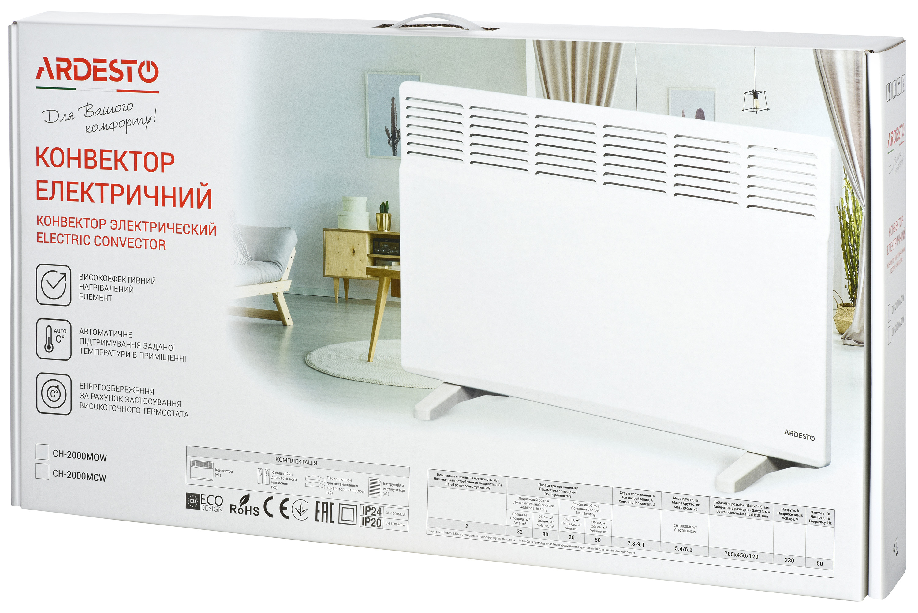 Характеристики Конвектор ARDESTO, 20м2, 2000Вт, мех. упр-ння, відкритий нагрів. елемент, білий код товару CH-2000MOW