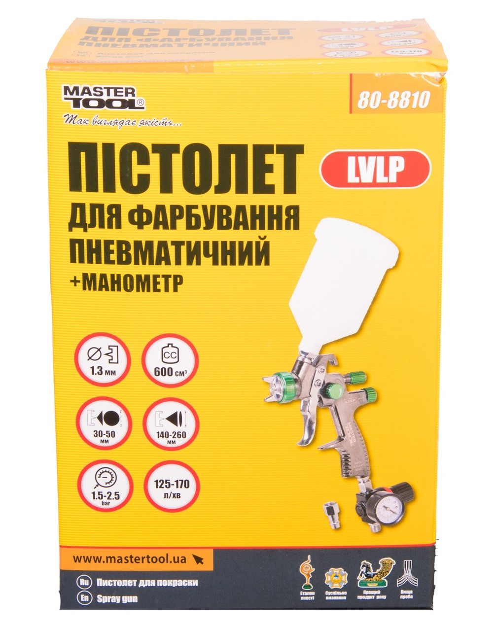 Характеристики Краскопульт MASTERTOOL LVLP 600 мл, 1.3 мм, 125-170 л/мин, 1.5-2.5 бар код товару 80-8810