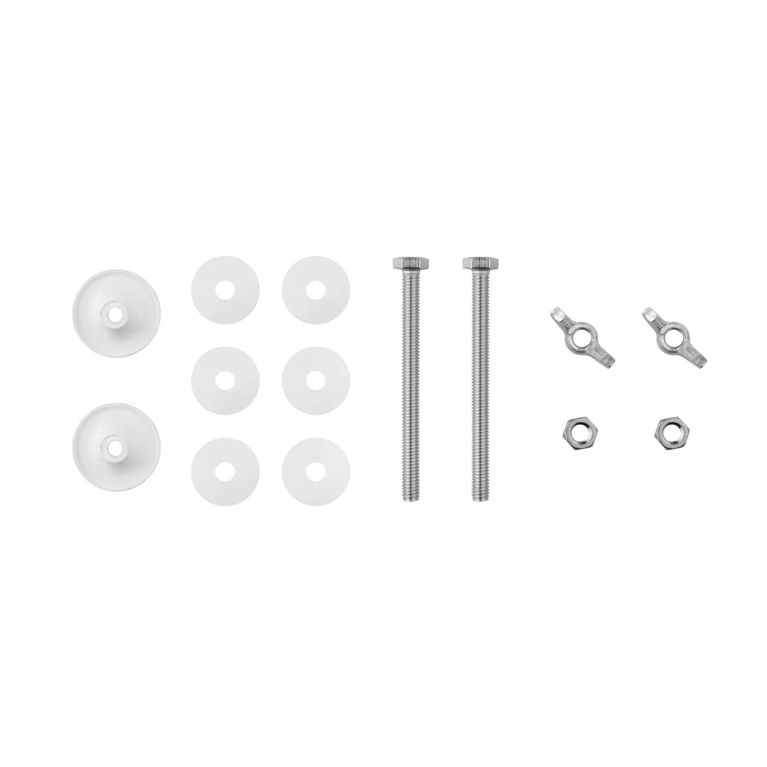 Комплект обеспечивает плотное соединение бачка с чашей унитаза, предотвращает люфт и протекание. Подходит для большинства стандартных моделей унитазов с расстоянием между крепежными отверстиями 80 мм.