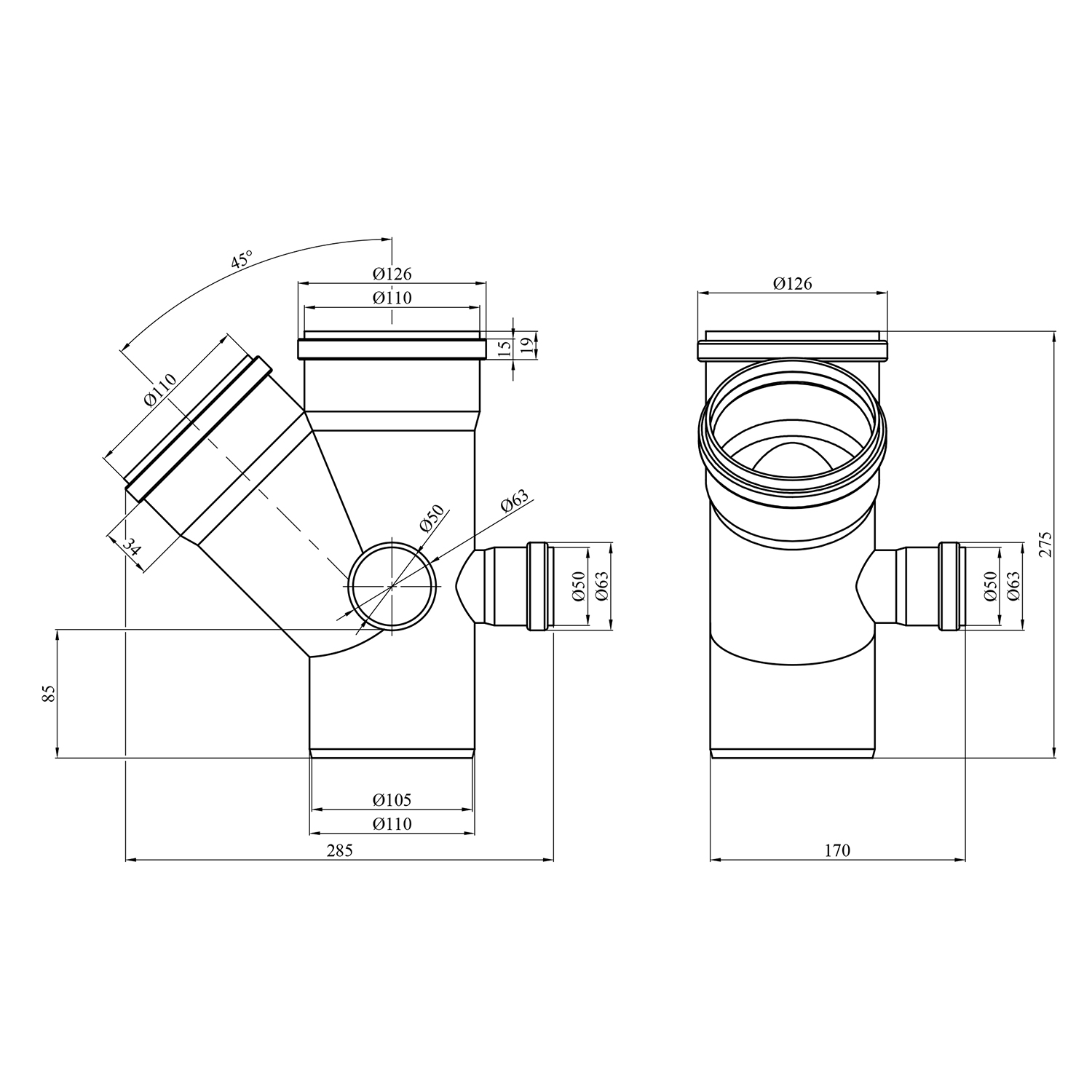 Характеристики Крестовина двухплоскостная для внутренней канализации Rozma 110х110/45°+2x50/90° код товару CV030233