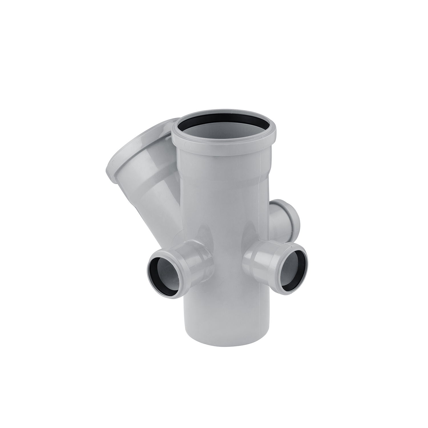 Описание Крестовина двухплоскостная для внутренней канализации Rozma 110х110/45°+50/90° код товару CV030237