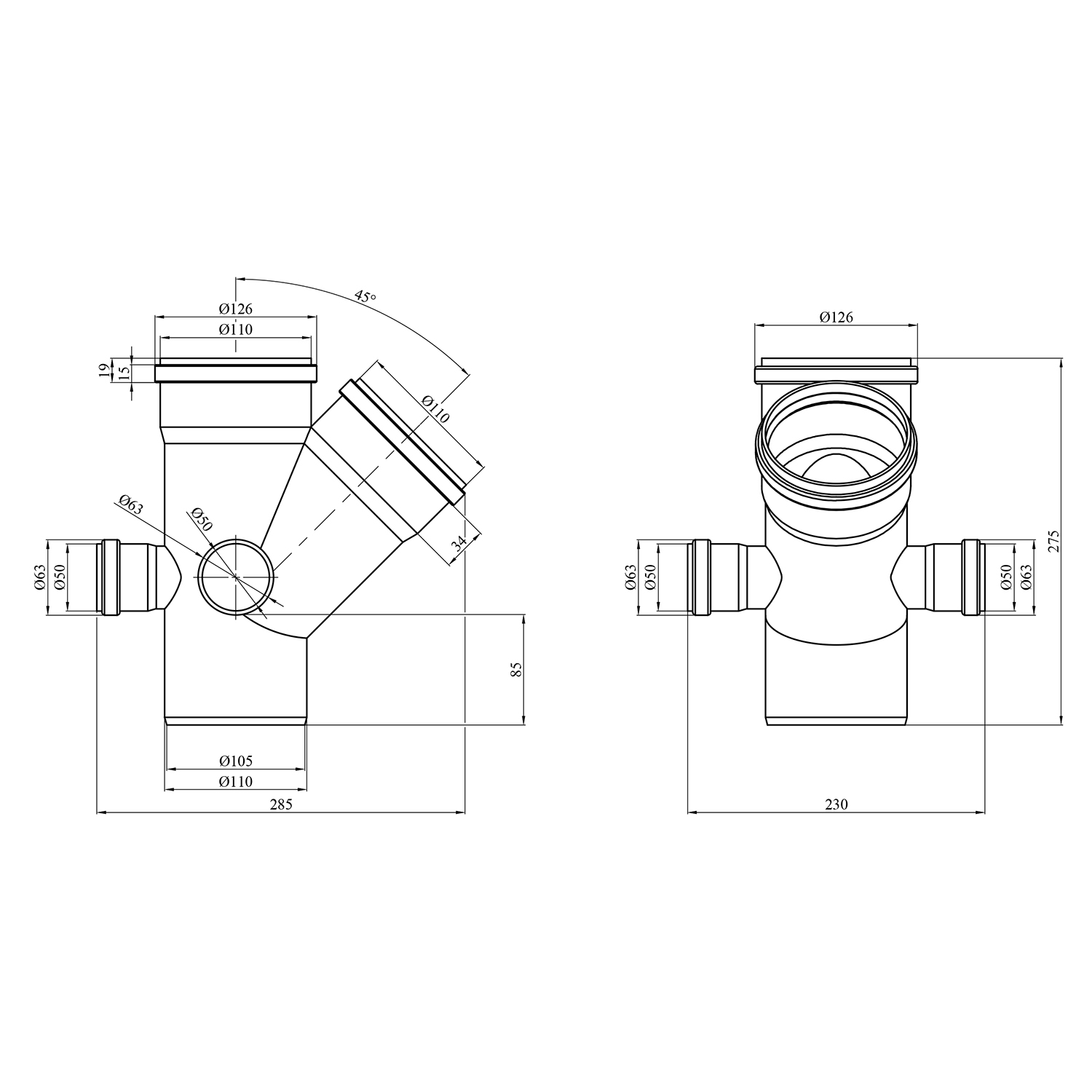 Характеристики Крестовина двухплоскостная для внутренней канализации Rozma 110х110/45°+50/90° код товару CV030237