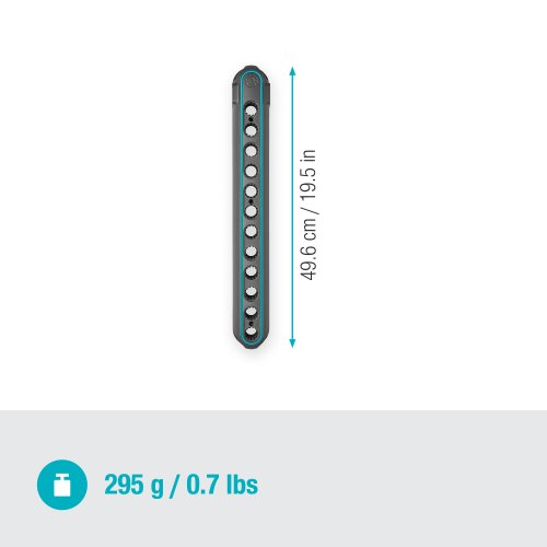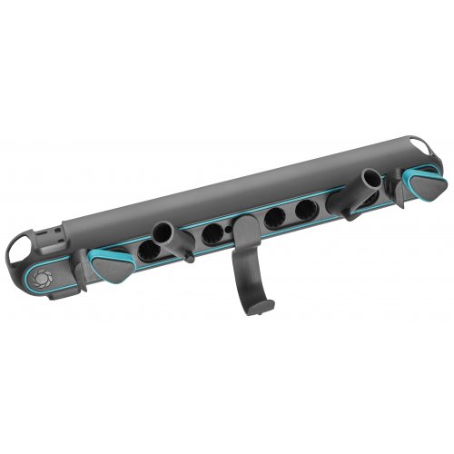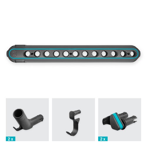 Оснащен 2 поворотными держателями для насадок Combisystem с маленькими крючками для секаторов или ножниц, универсальным крючком для различных инструментов, а также боковыми держателями для инструмента с длинной ручкой или насадок Original.