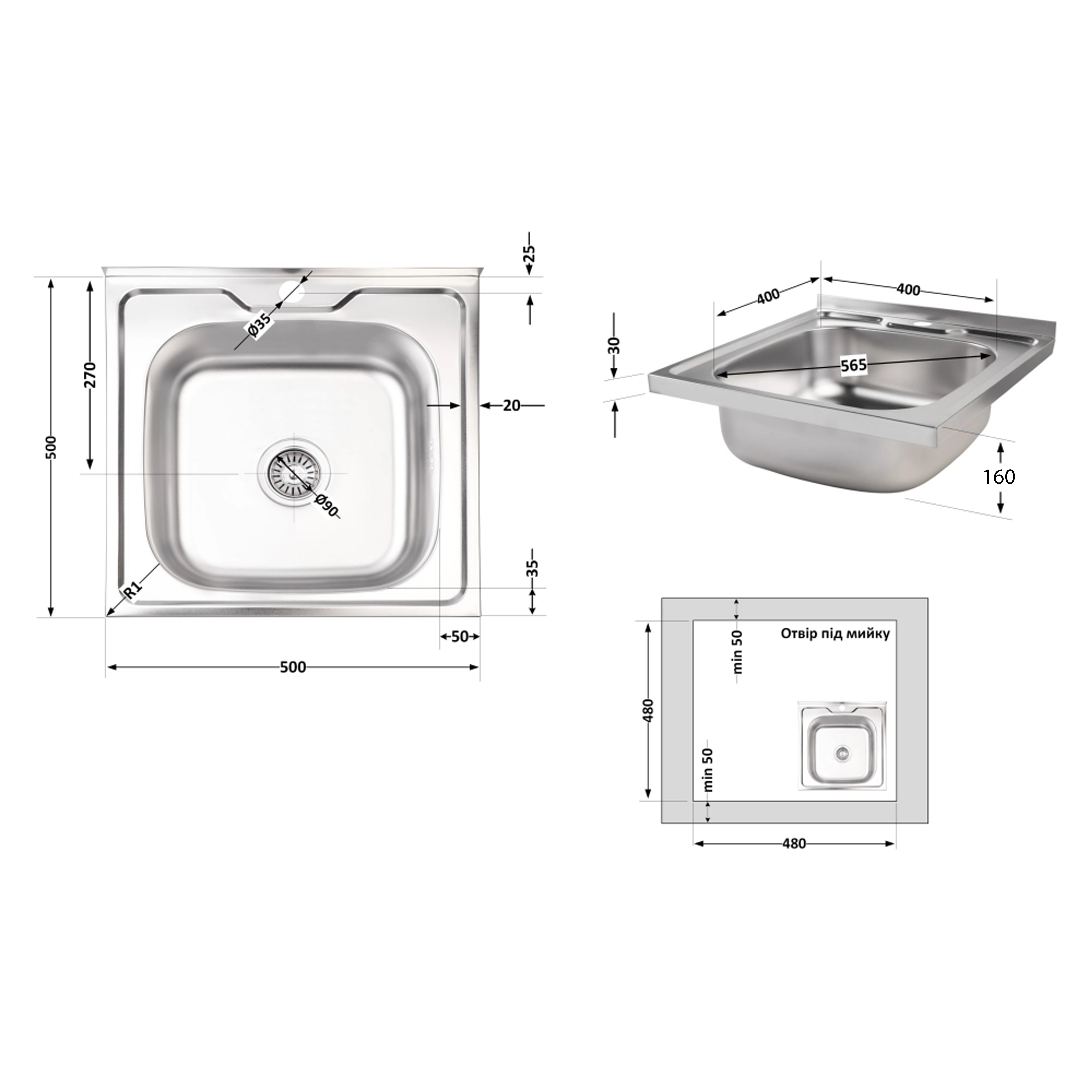 Описание Кухонная мойка Brinex 5050 0,6 мм Satin (BRIN5050SAT06) код товару SD00054100