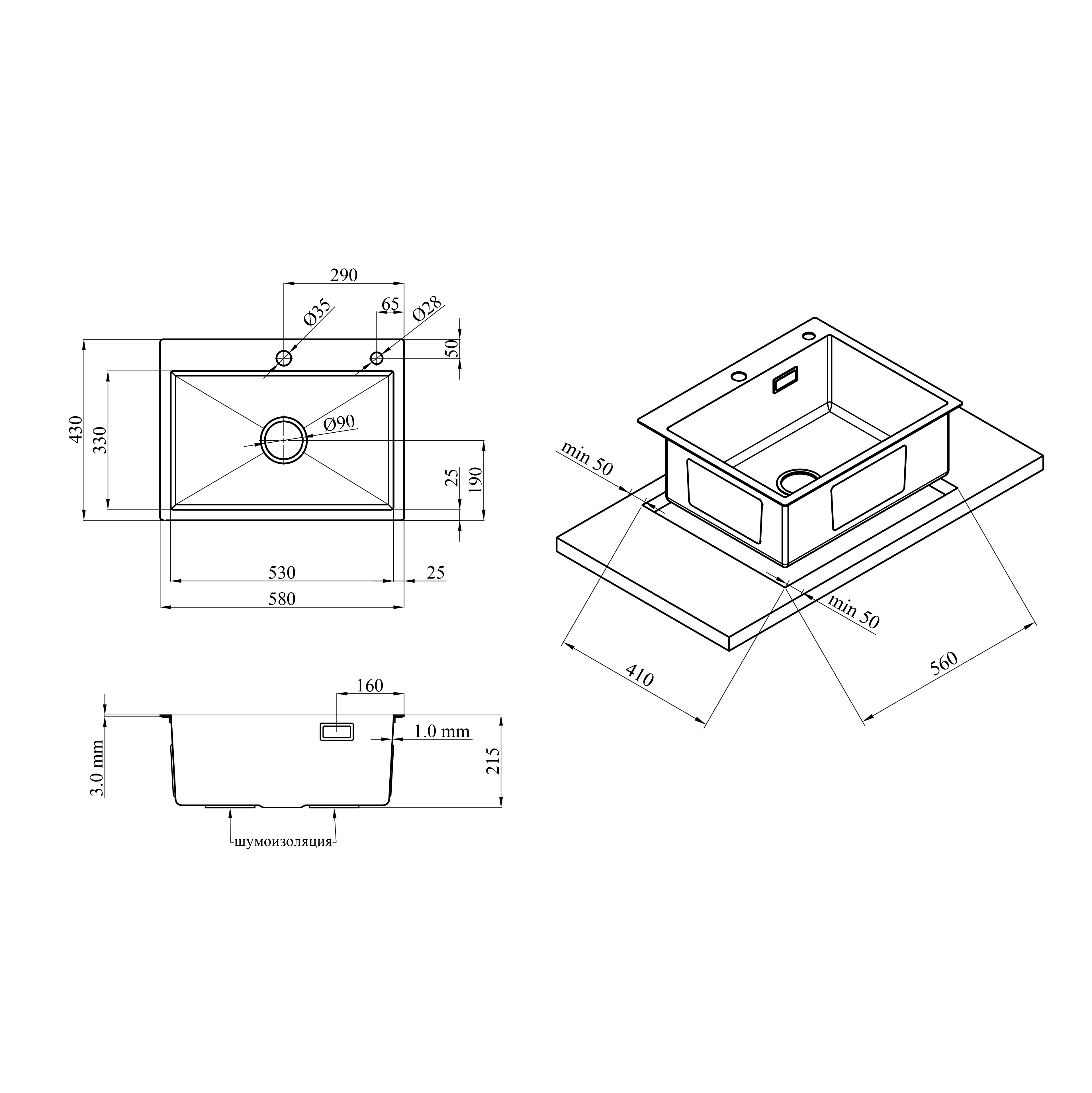 Толщина материала мойки, мм