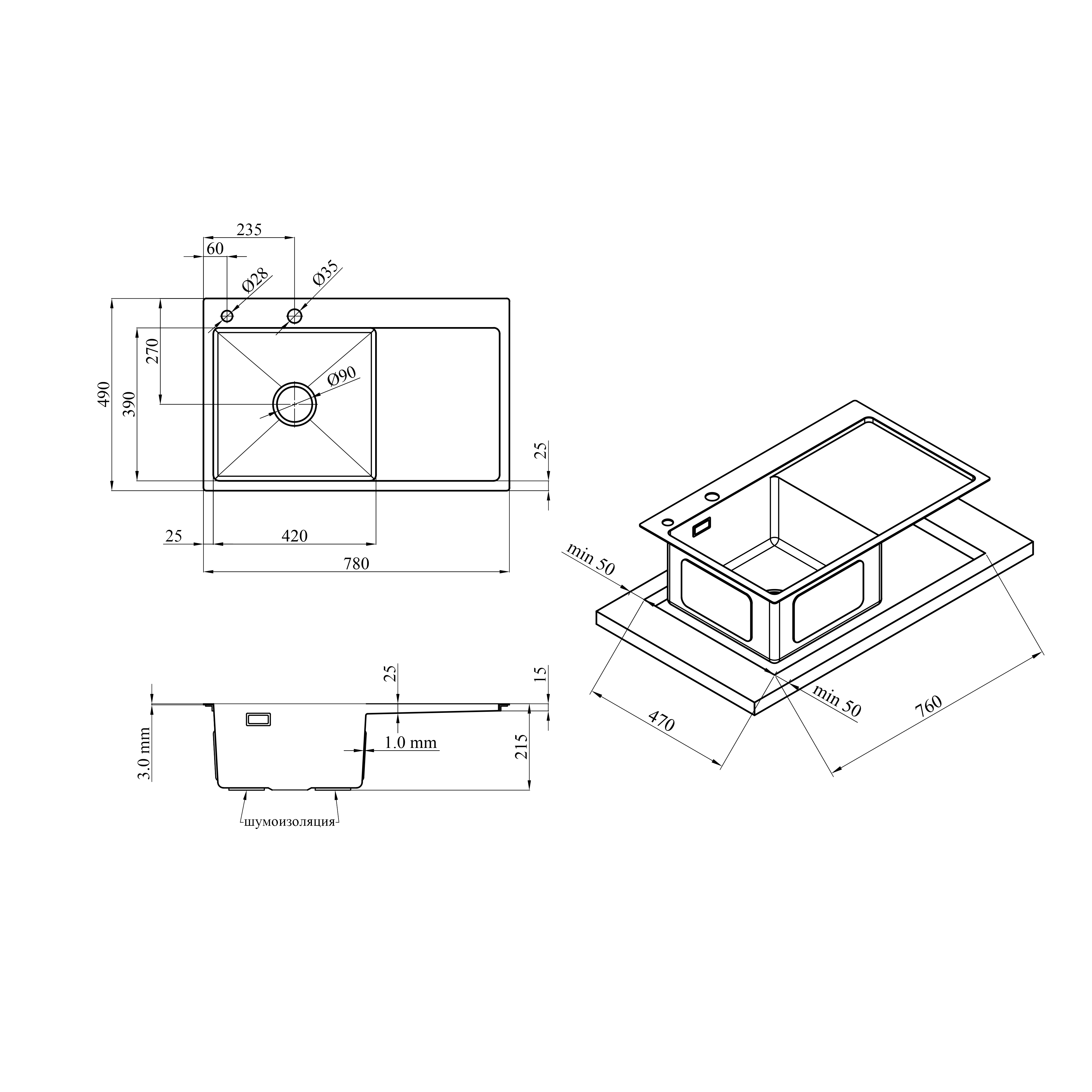 Толщина материала мойки, мм