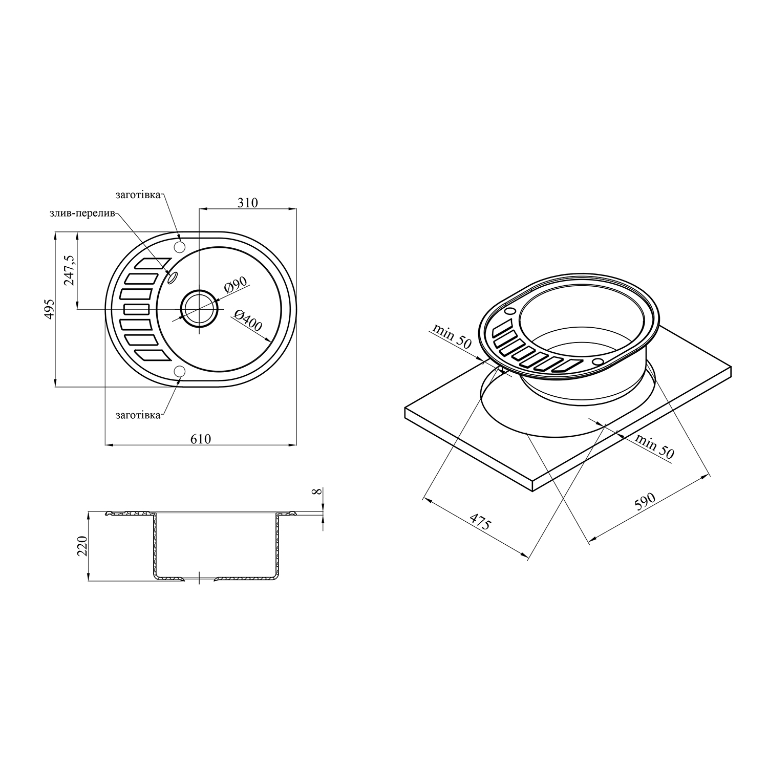 Размеры: 620 x 500 мм, идеальна для компактных кухонь.