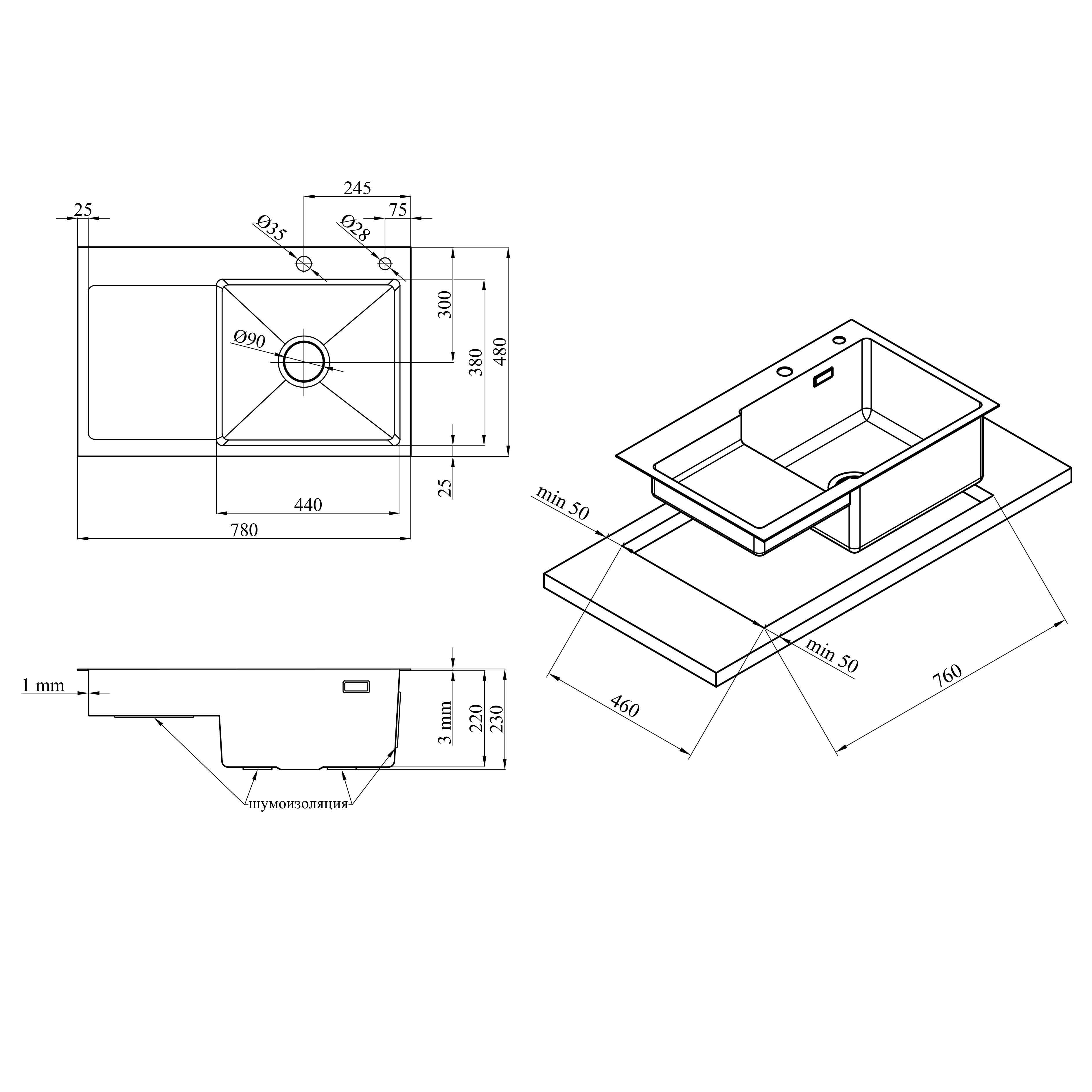 Характеристики Кухонная мойка Kroner KRP PVD Schwarze 7848RHM 3,0/1,0 мм код товару CV030024