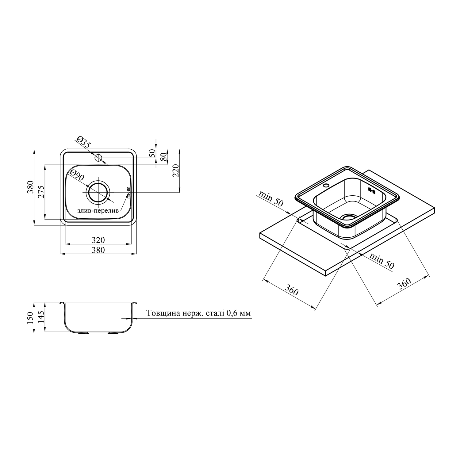 Описание Кухонная мойка Kroner KRP Satin 3838 (0,6 мм) код товару CV022756