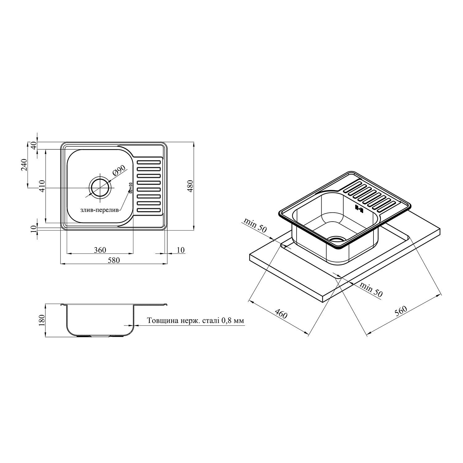 Толщина материала мойки, мм