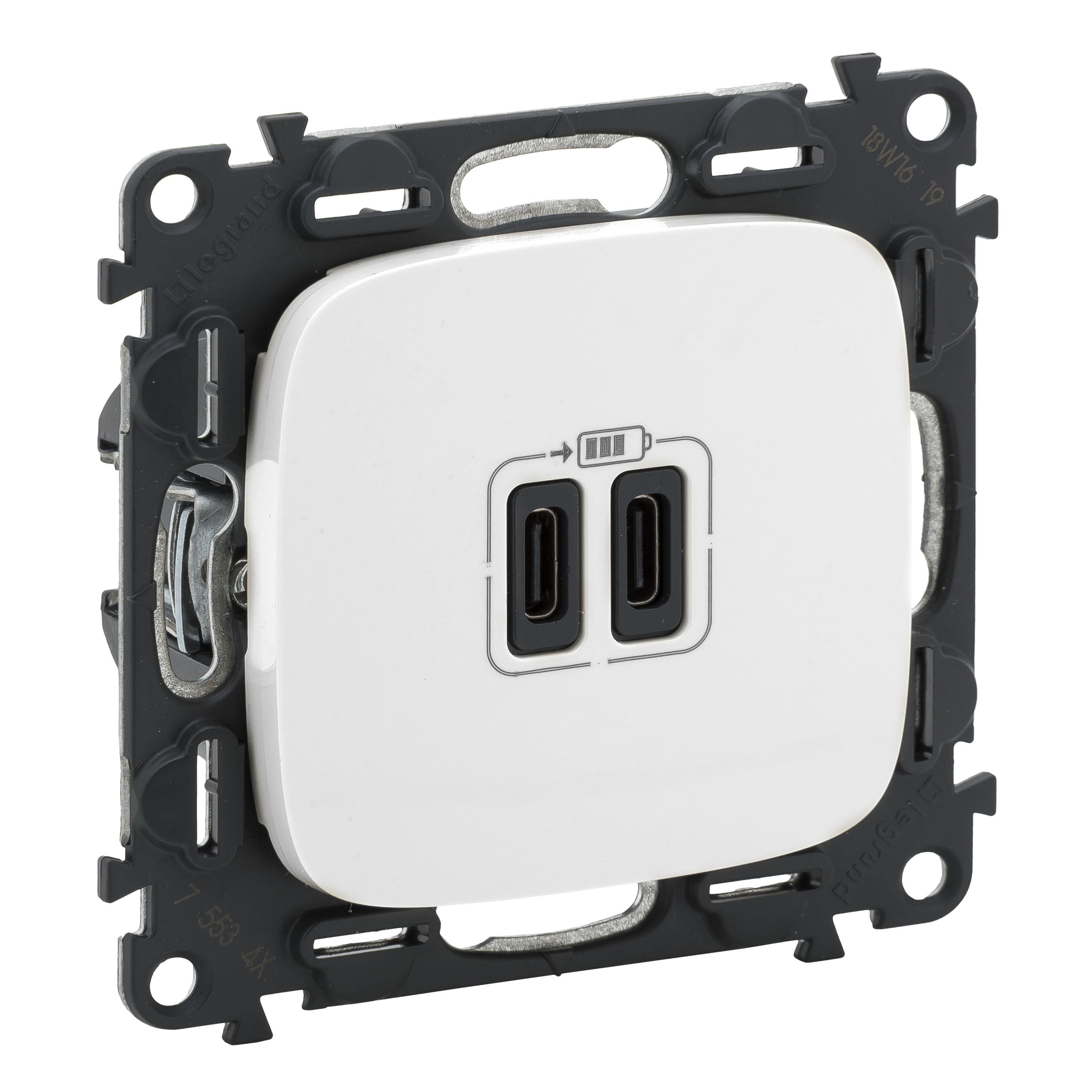 Подвійна розетка Valena Allure призначена як зарядний пристрій потужністю 3 Ампери з 2ма виходами USB тип С. У комплектацію входить: супорт, лицьова панель і зарядний механізм. Залишається підібрати необхідну рамку з колекції Valena Allure. Ця нова USB-розетка, більш потужна і, перш за все, більш сумісна, як зарядний пристрій. Великий плюс нового механізму - його потужність, 15 Вт, сучасних смартфонів стає все більше, і їх акумулятор вимагає все більше і більше енергії. Особливість заряду: Щоб мати максимальну потужність 3000 мА, ви повинні або використовувати тільки 1 порт USB типу C. Якщо підключити два кабелі, то потужність буде ділитися.