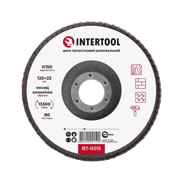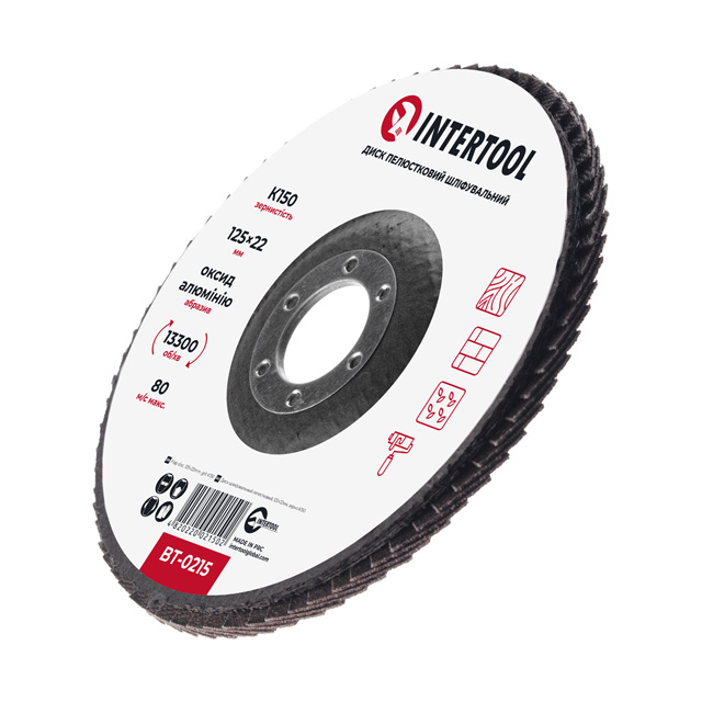 Характеристики Лепестковый шлифовальный диск 125x22мм, зерно K150 INTERTOOL BT-0215 код товару BT-0215