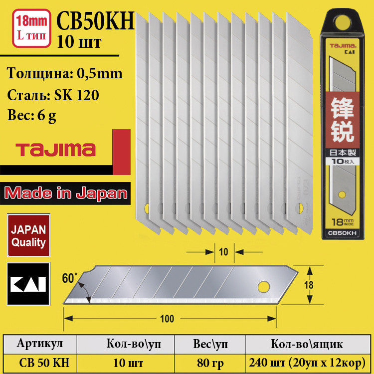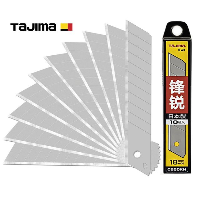 Характеристики Лезвия для ножа 18 мм TAJIMA (Япония) CB50KH ультра острые сегментные 10 шт код товару 1102-2543-COPY