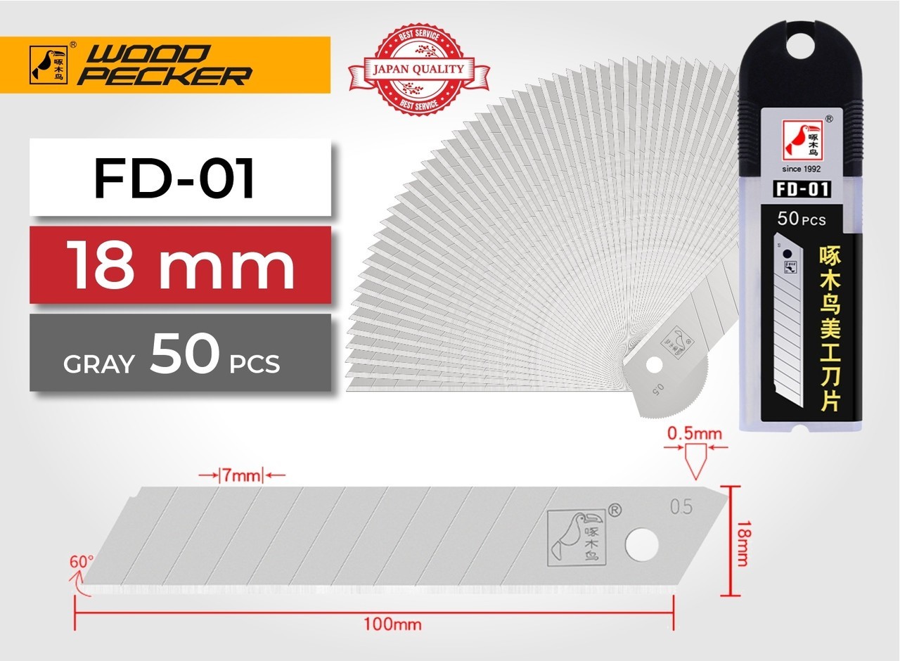 Описание Лезвия для ножа 18 мм Woodpecker серые, 50 шт код товару FD-01