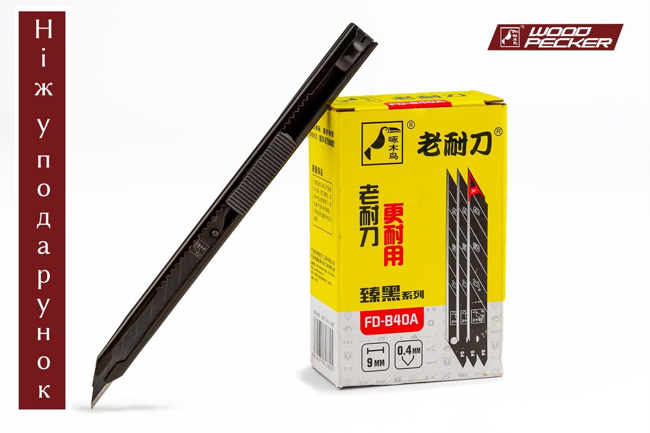Описание Лезвия для ножа 9 мм 30° Woodpecker черные 100 шт + подарок нож FD-707S код товару FD-B40A-707S