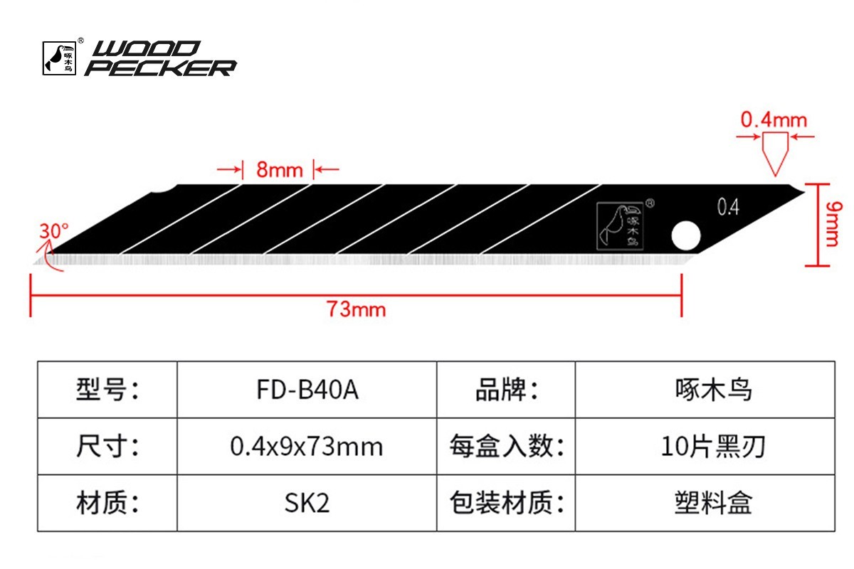 Описание Лезвия для ножа 9 мм 30° Woodpecker черные ультраострые, 10 шт. код товару FD-B40A