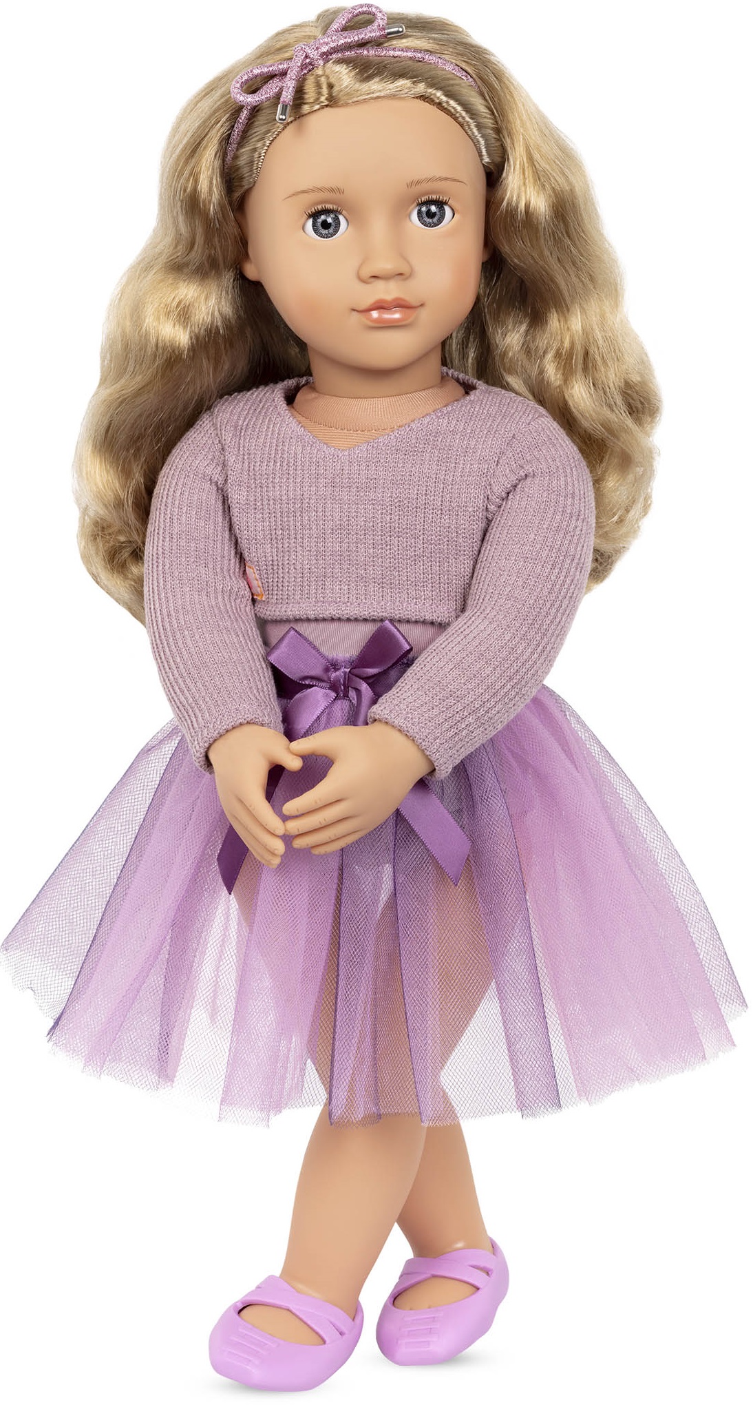 Танцюйте і сяйте разом із Саванною,46-см лялькою-балериною Our Generation з довгим хвилястим світлим волоссям і темно-синіми очима, які відкриваються і закриваються! Саванна може обертати шиєю, руками та ногами, виконуючи піруети та інші забавні пози балету, коли вона танцює на сцені. Одягніть в рожеву кофтину Саванну, коли вона репетирує свій виступ, а потім влаштуйте чарівне шоу у її приголомшливій балетній сукні! Вона має рожеве плаття-трико з світло-фіолетовою спідницею з вуалі та декоративною стрічкою на талії. А відповідна пов'язка додає додаткової нотки солодкості її зачісці. Комплектація: 46-см лялька Саванна, балетна сукня, кофтина, пов'язка із блискітками, пара балеток.