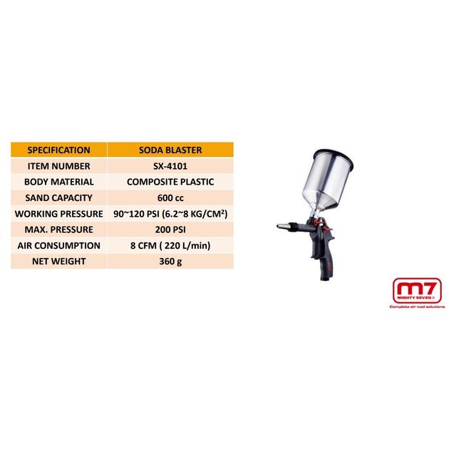 Mighty Seven SX-4101 - пневматичне обладнання для очищення поверхонь за допомогою спрямованого потоку абразивного матеріалу, наприклад піску. Підходить для усунення іржі, шару фарби або лаку, окалини.