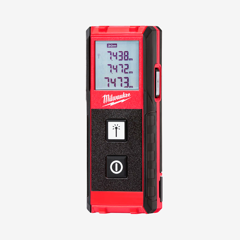 Трирядковий LCD дисплей з білим підсвічуванням. Дві кнопки управління на передній та бічній стороні корпусу для зручності користувача. On/Off кнопка з функцією вибору систем вимірювань (метри, фути, дюйми). Функція безперервного вимірювання. Індикація низького заряду. Пам'ять останніх трьох вимірів відображається на дисплеї. Знімна кліпса для кріплення на ремені. Міцний та стійкий до ударів корпус. IP54 захист від бризок води та пилу. Комплектація Далекомір лазерний LDM30 - 1 шт. Кліпса на ремінь - 1шт. Батарейки ААА - 2 шт. Блістер.