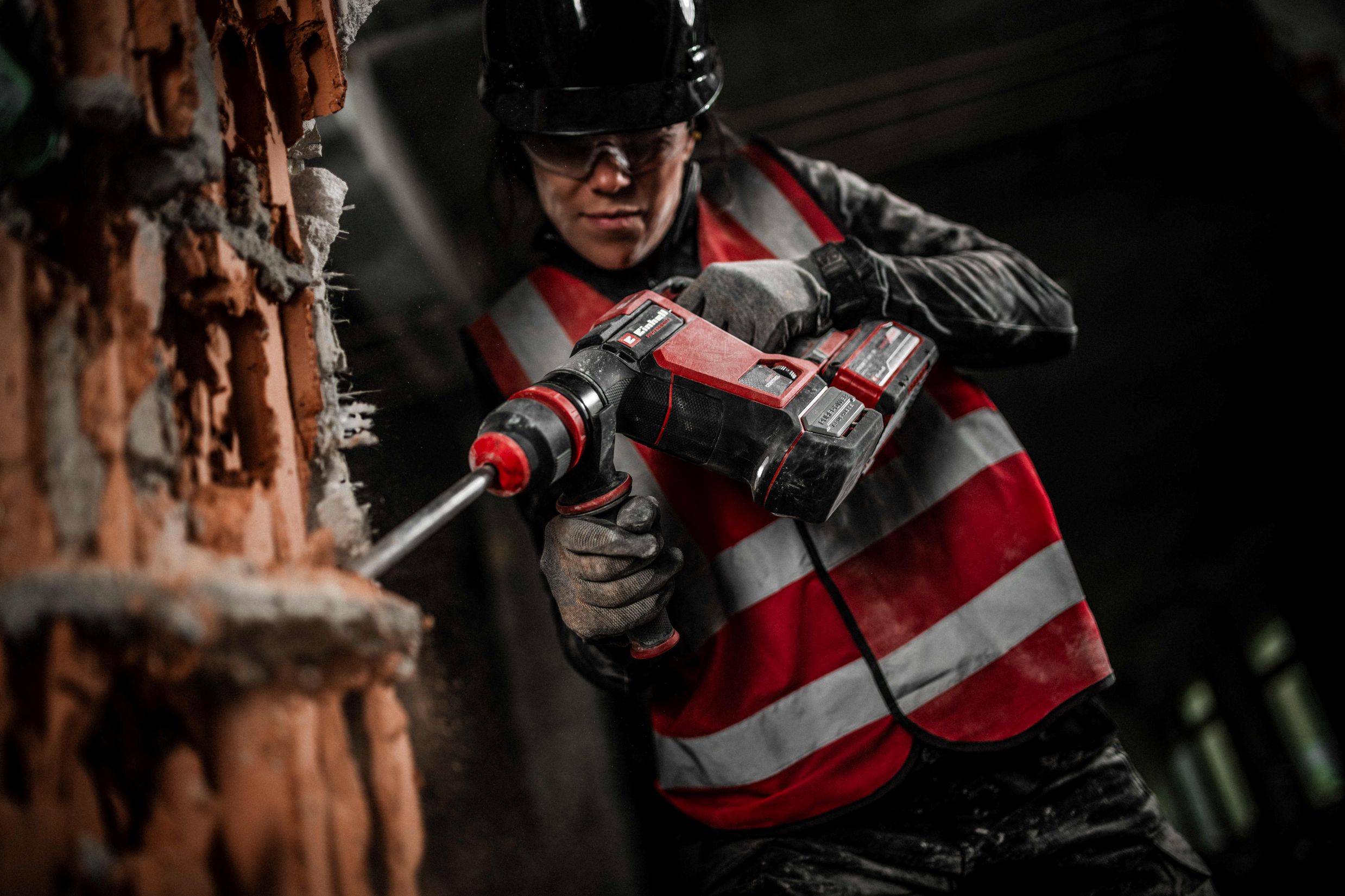 Einhell Professional TP-DH 18/4 Li BL-Solo — компактний акумуляторний відбійний молоток для легких демонтажних робіт і точного довбання. Енергія удару 4,0 Дж, безщітковий двигун і система Power X-Change забезпечують мобільність без мережі. SDS-Plus із напівавтоматикою пришвидшує заміну зубил, а 16-позиційне встановлення дає змогу точно задати кут.