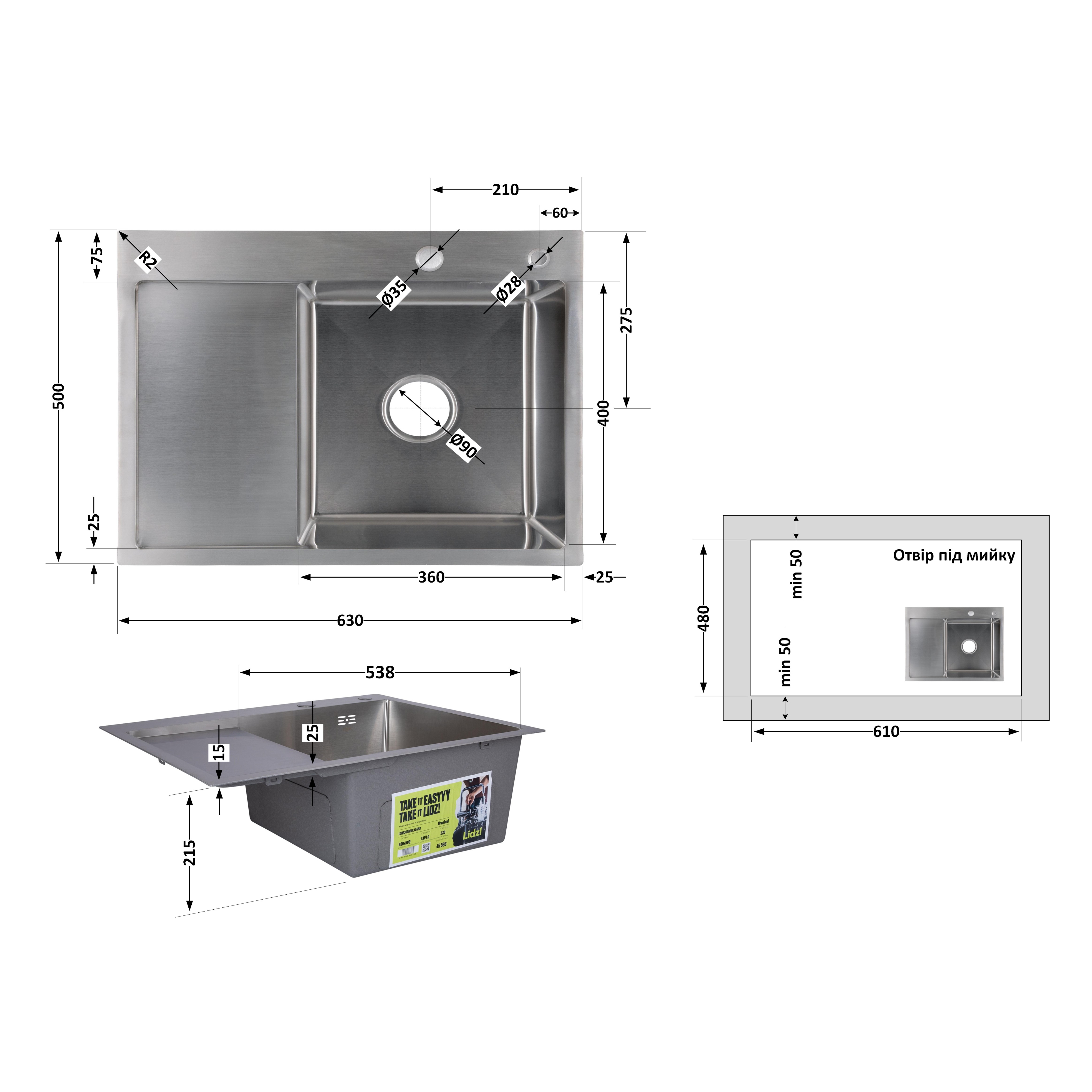 Характеристики Мойка кухонная интегрированная левая Lidz Handmade H6350L, нержавеющая сталь код товару SD00051712