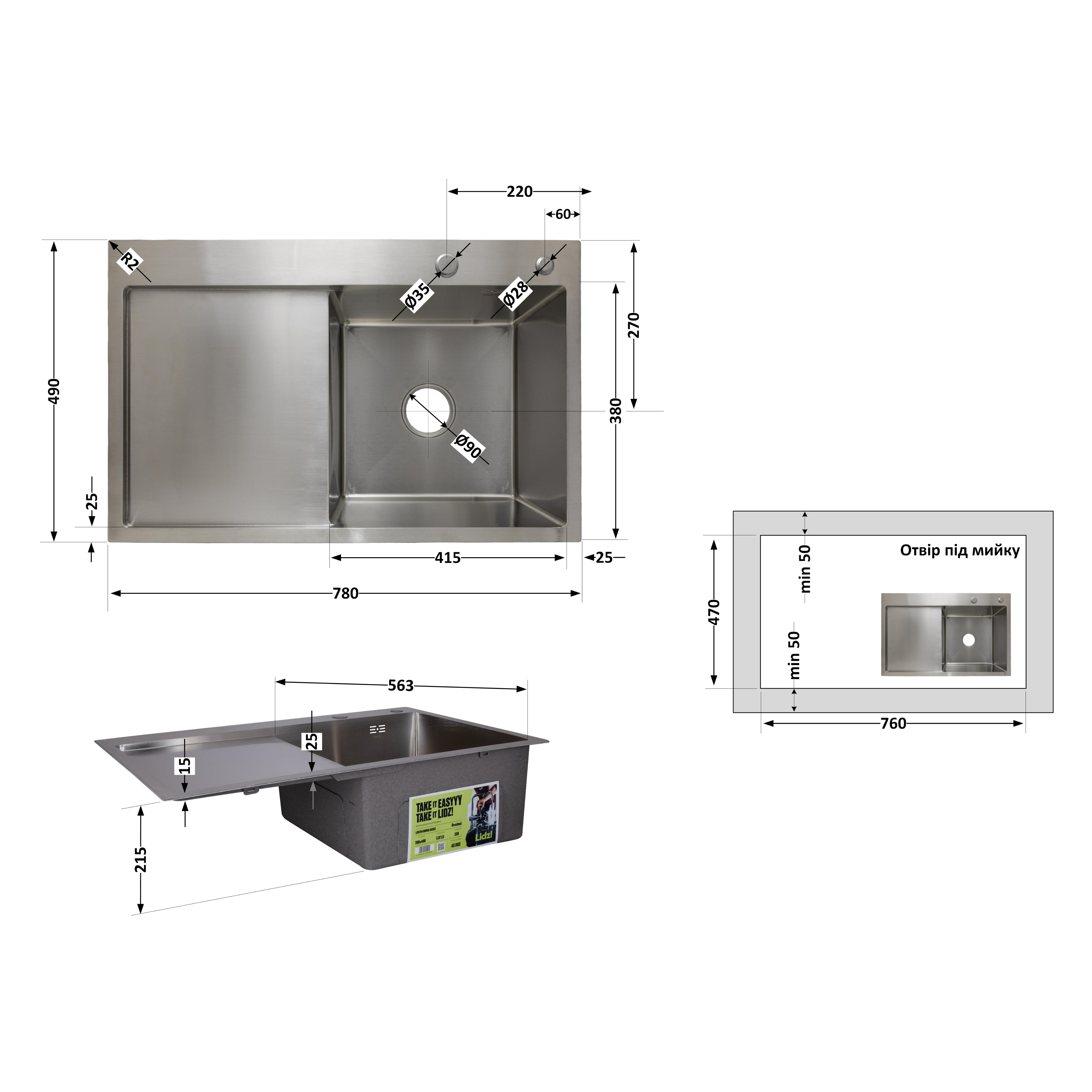 Характеристики Мойка кухонная левая Lidz Handmade H7849L, нержавеющая сталь 3,0/1,0 мм код товару SD00051716
