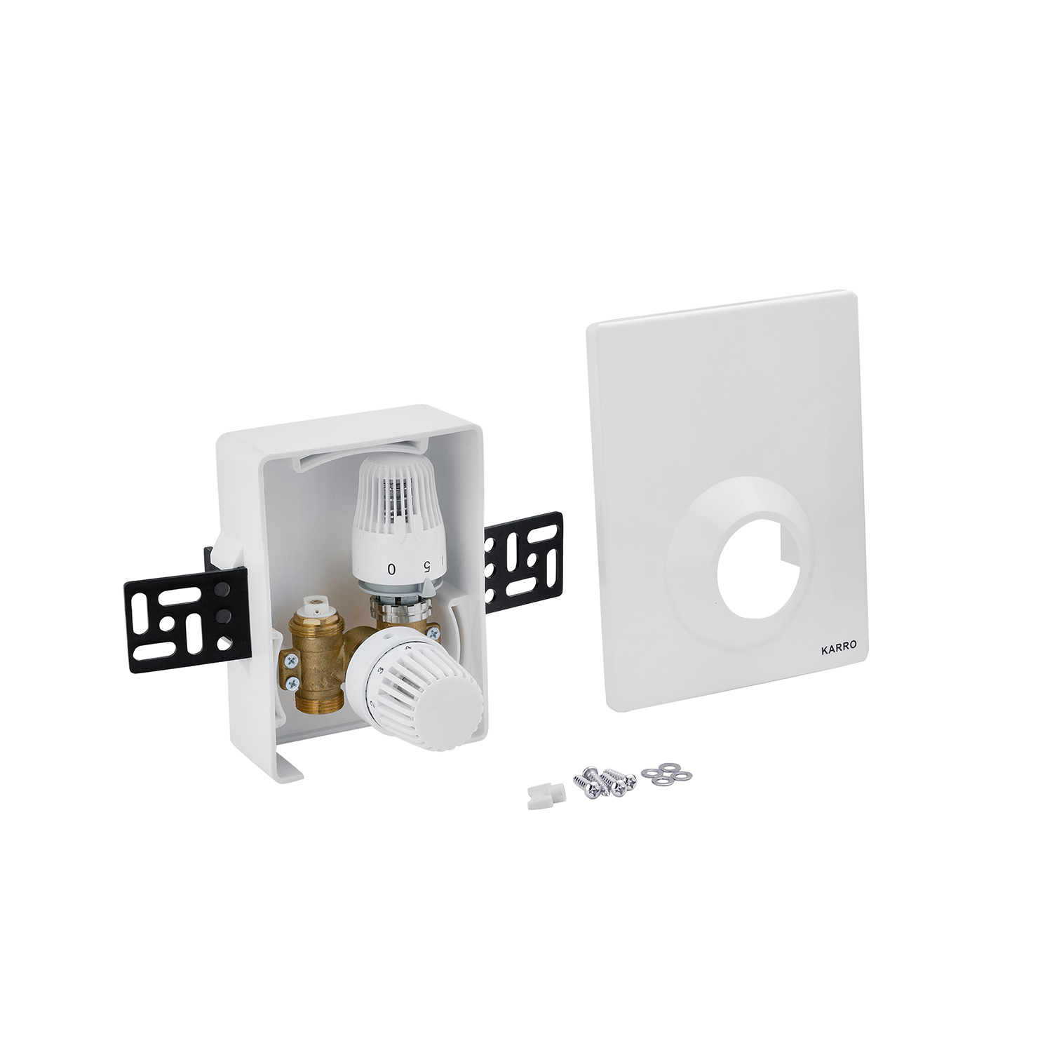 Бокс скрытого монтажа, декоративная крышка, крепежные планки, термостатический клапан, кран Маевского, термоголовка, крепежные винты, ключ, термоголовка R, плоские шайбы 4 шт.