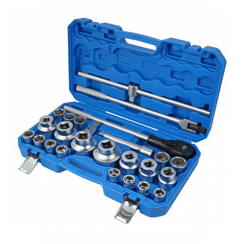Набір з 26 предметів, що складається з тріскачки, торцевих головок та інших аксесуарів 3/4’’ і 1”. Незамінний інструмент для будь-якої майстерні або автосервісу.