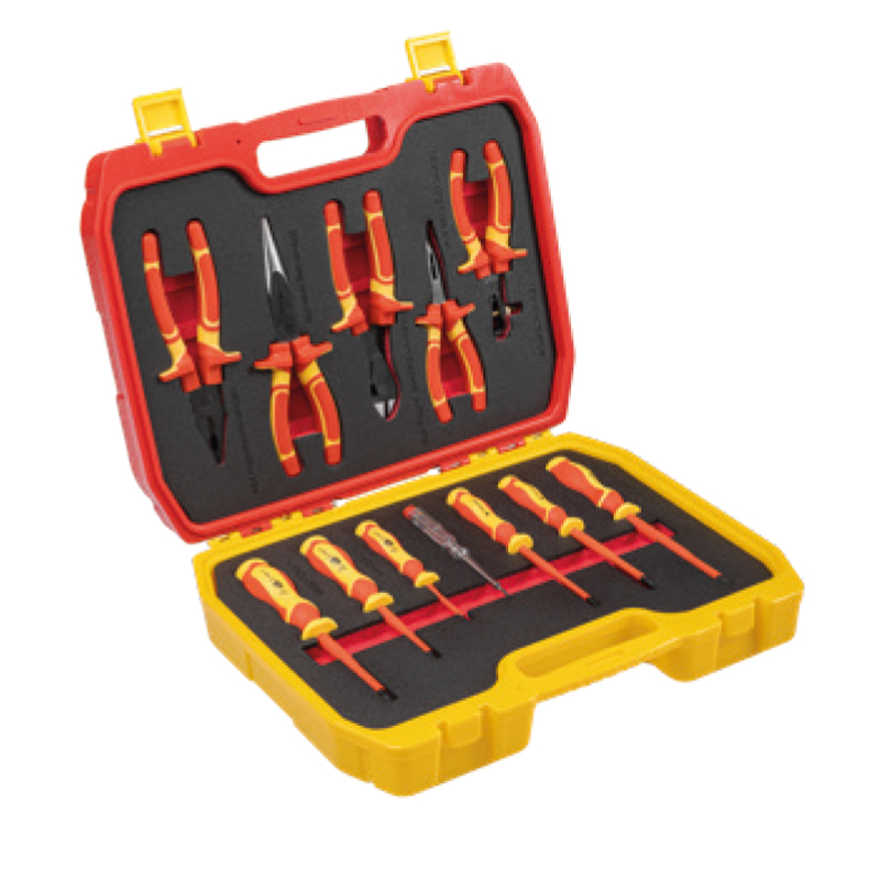 Набір з 12 діелектричних інструментів з сертифікатом VDE для роботи з напругою до 1000 В. Складається з викруток, плоскогубців та тестера напруги. Інструменти призначені для електриків, а також механіків та монтажників.