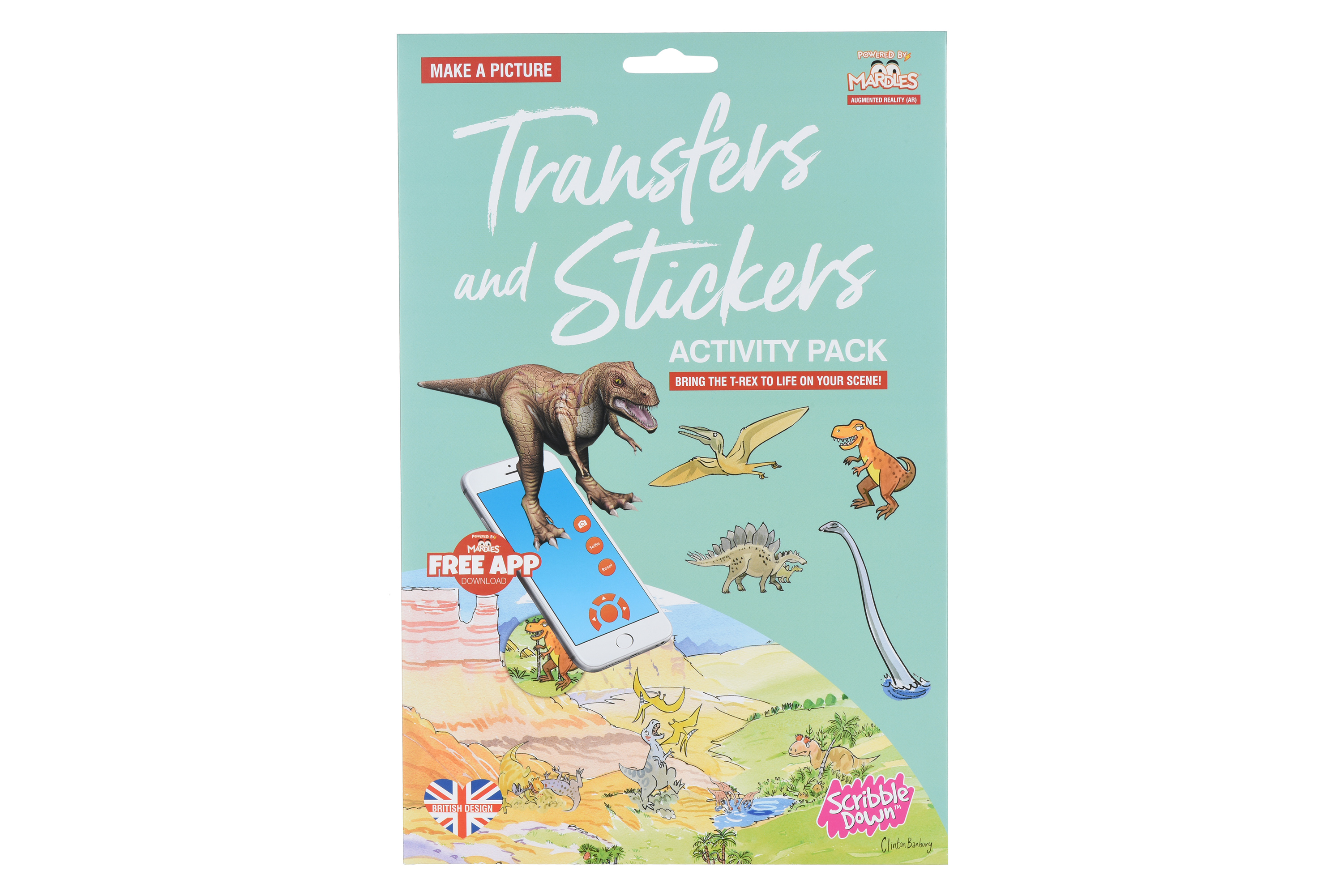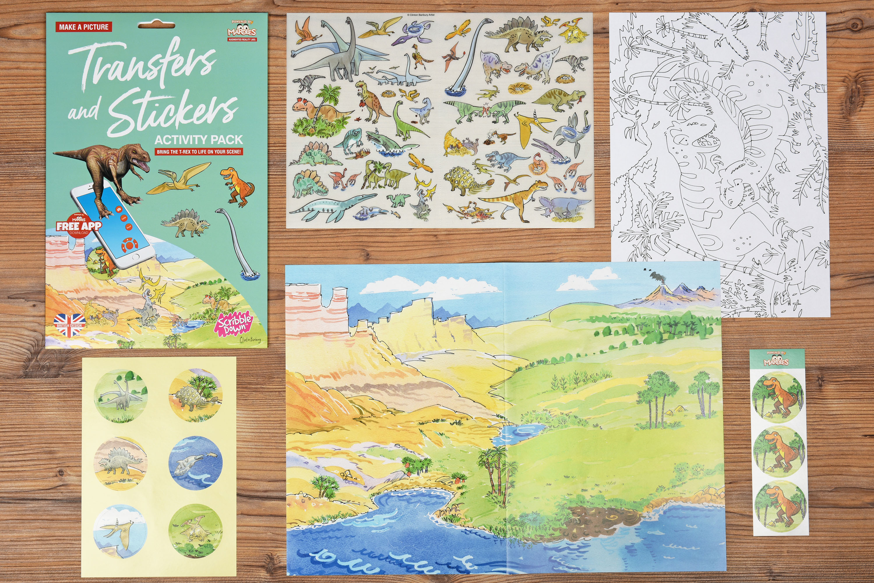Перевідні наклейки Scribble Down ""Динозаври"" з онлайн додатком - універсальний набір для творчості. Застосування різноманітне - перетворення різних предметів за допомогою обраних наклейок з набору, доповнення / створення власної історії, сюжету або гри. За допомогою безкоштовного додатку Mardles можна ""оживити"" наклейку повітряної кулі!Наклейки легко переносяться, досить лише прикласти картинку на передбачувану для переводу поверхню і заштрихувати олівцем, кульковою ручкою або будь-яким предметом, яким можна настиснути на площу картинки, яка переводиться . При цьому не натискаючи на сусідні картинки. Акуратно підняти лист носія з картинками - піднімаючи, картинка залишиться на поверхні. Підходить для переводу на будь-яку пластикову, паперову, металеву та іншу поверхні.