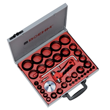 Цей набір дозволяє різати ущільнення, гранули або шайби до 60 мм. Просічки дуже легко фіксуються на патроні завдяки системі шпильок і можуть бути здвоєні, щоб вирізати кільце за одну операцію.