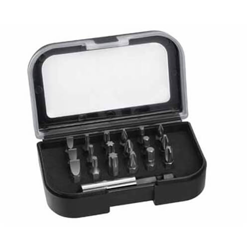 - 19 шт. Пластиковая коробка. Биты 25 мм - 1/4″ под прямой шлиц: 4.5, 5.5, 6.5 мм. Биты 25 мм - 1/4″ под шлиц ″Philips″: Ph1, Ph2. Биты 25 мм - 1/4″ под шлиц ″Pozidriv″: Pz1, Pz2, Pz3, Pz4. Вставки 25 мм - 1/4″ под шлиц ″Torx″: T10, T15, T20, T25, T30, T40.