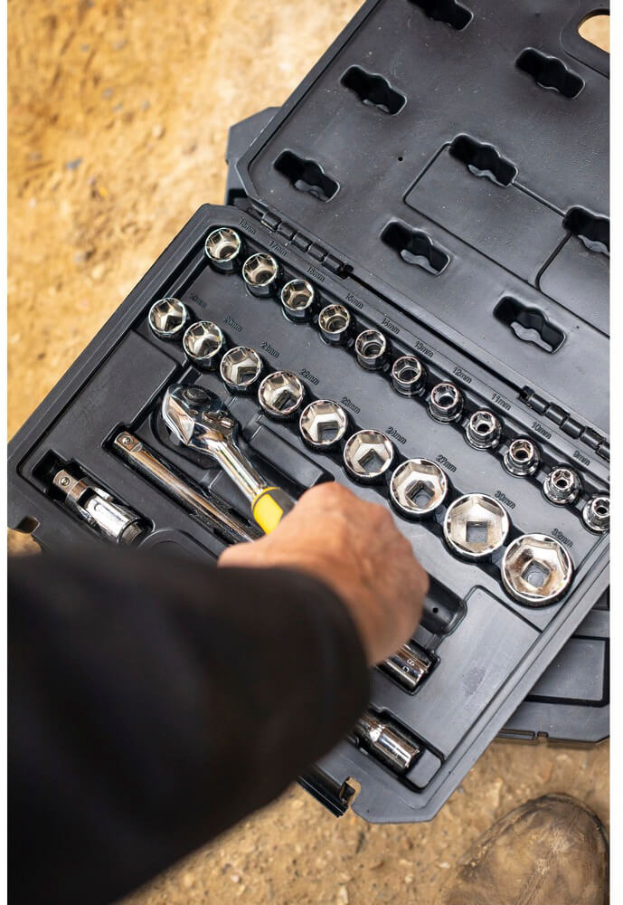- Пластиковый кейс с металлическими защелками;. Головки торцевые шестигранные 1/2″: 8, 9, 10, 11, 12, 13,14,15, 16,17, 18, 19, 20, 21, 22, 23, 24, 27, 30, 32 мм;. Рукоятка с храповым механизмом 1/2″;. Удлинители 1/2″: 75, 250 мм;. Шарнир карданный 1/2″.