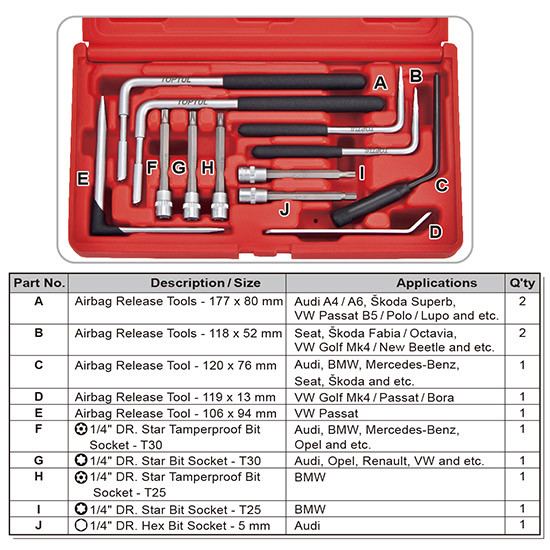 Характеристики Набор инструмента для снятия подушек безопасности рулевого колеса 12ед. TOPTUL JGAI1206 код товару JGAI1206