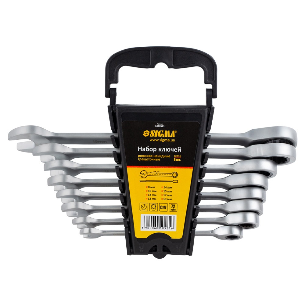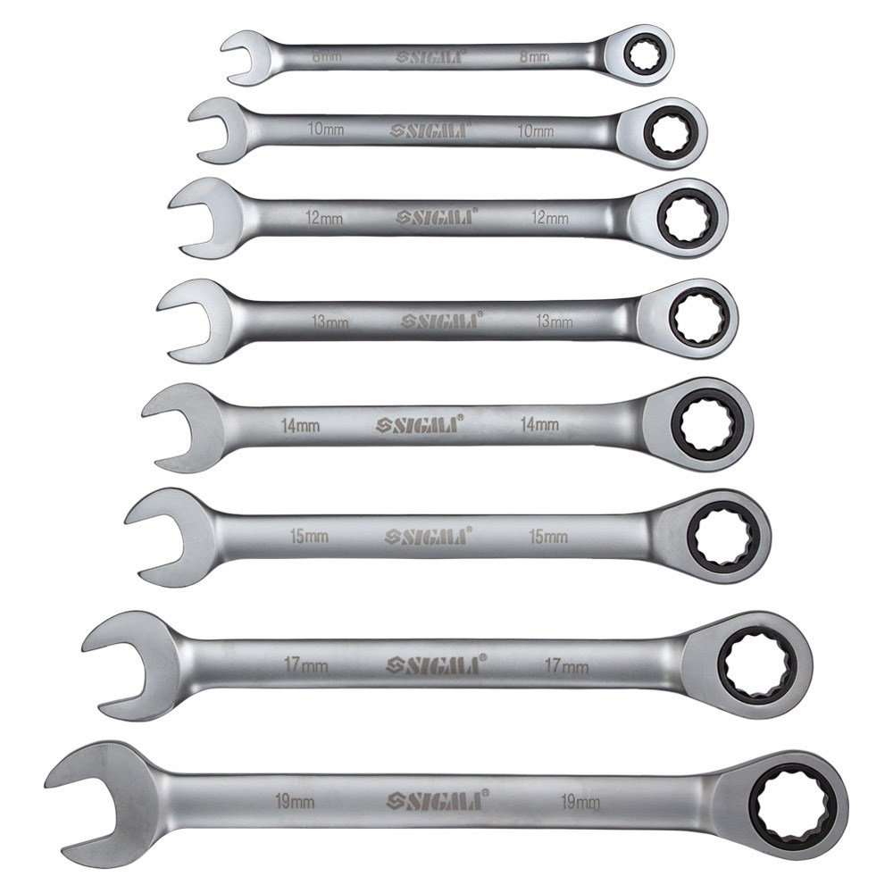 Описание Набор ключей рожково-накидных трещоточных 8шт 8-19мм CrV SIGMA код товару 6010521
