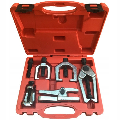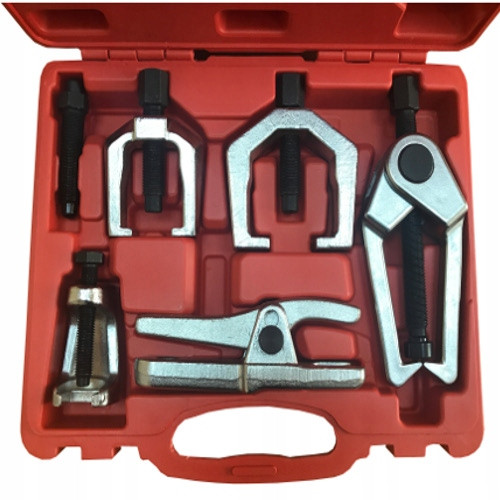 Набор съемников шаровых опор и рулевых наконечников (5 шт.) предназначен для быстрого и безопасного демонтажа деталей подвески. Изготовлен из прочной стали, подходит для большинства автомобилей.