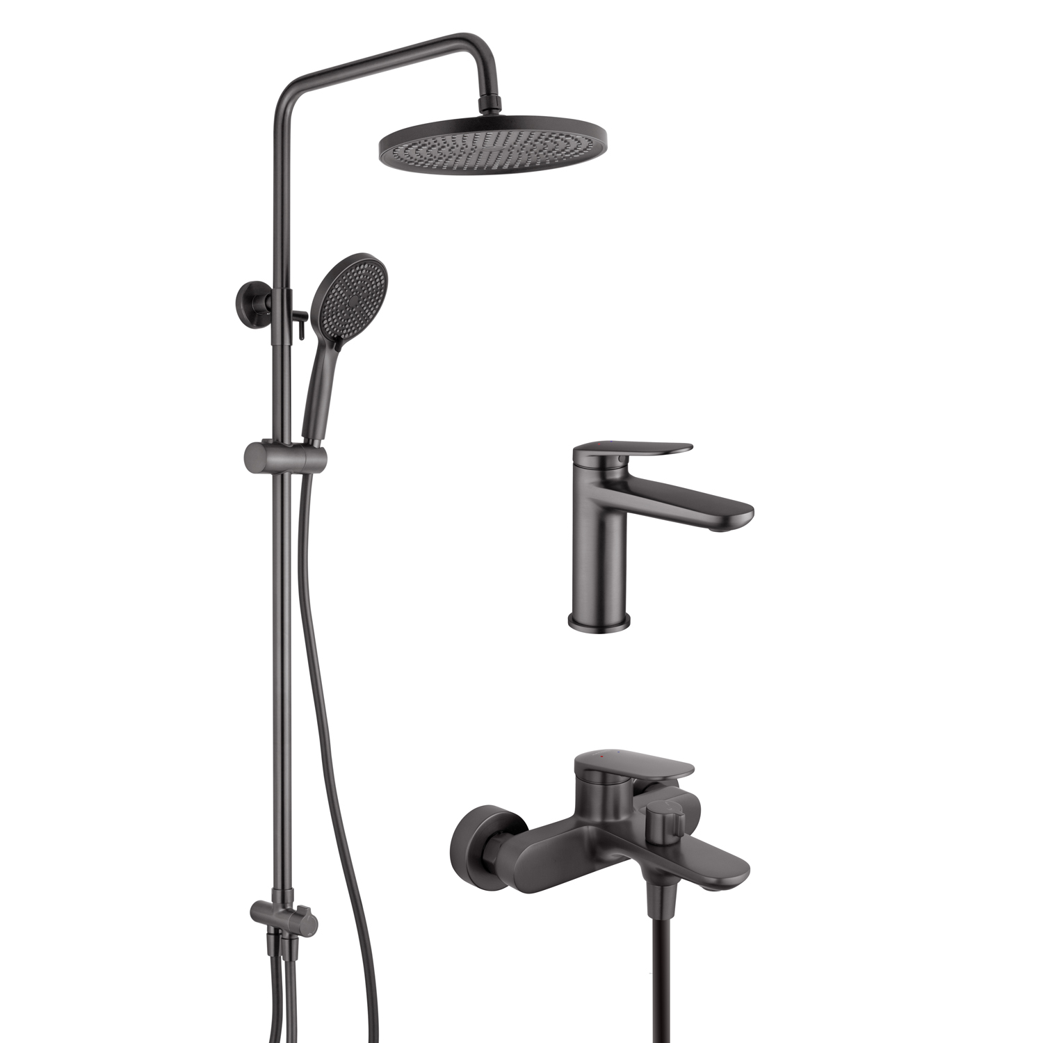 Набор смесителей Kroner Element 211801-3801 (графит) — современное и стильное решение для ванной комнаты, выполненное в актуальном графитовом цвете с матовым покрытием. Такой дизайн эффектно подчёркивает интерьер и идеально вписывается в стили лофт, модерн и минимализм.