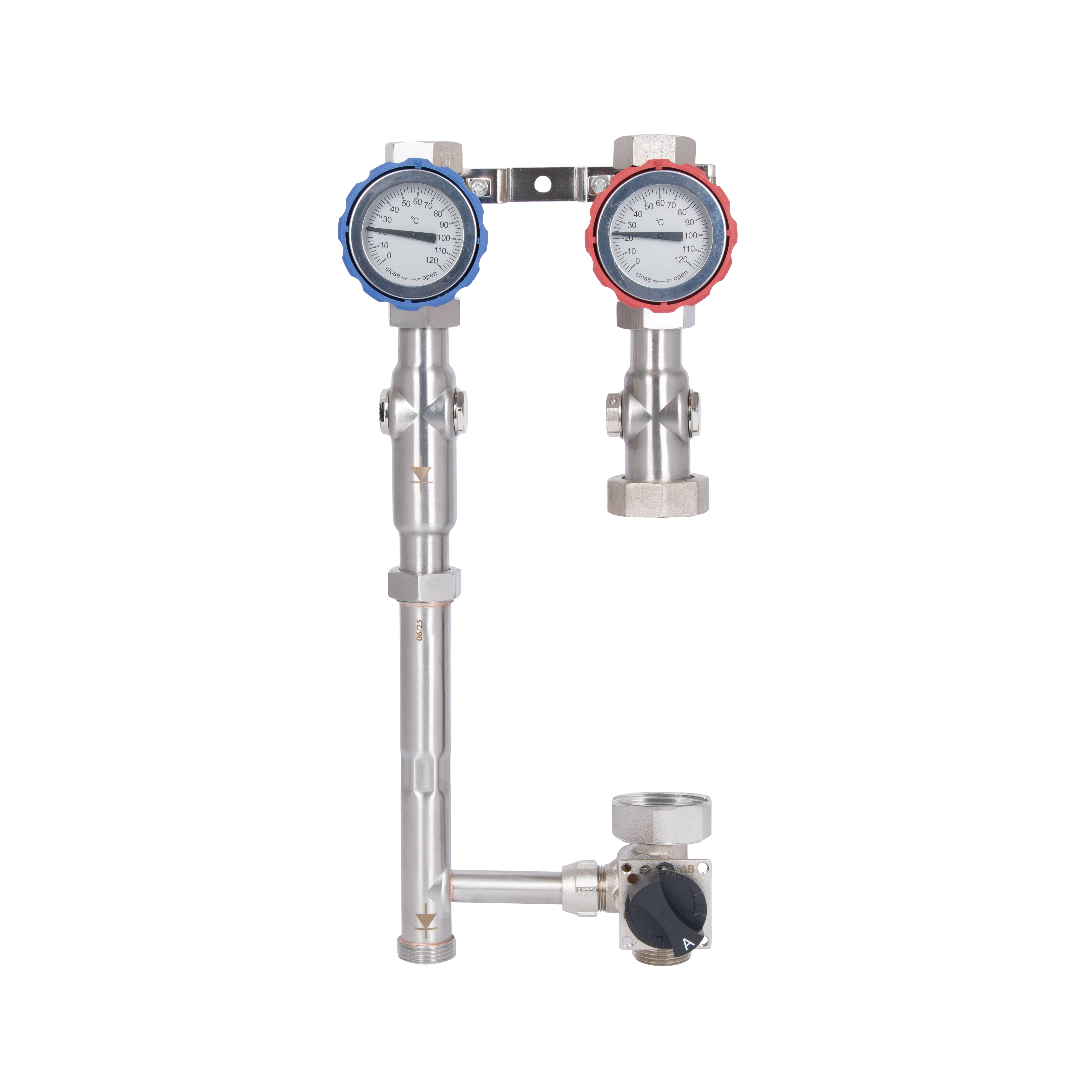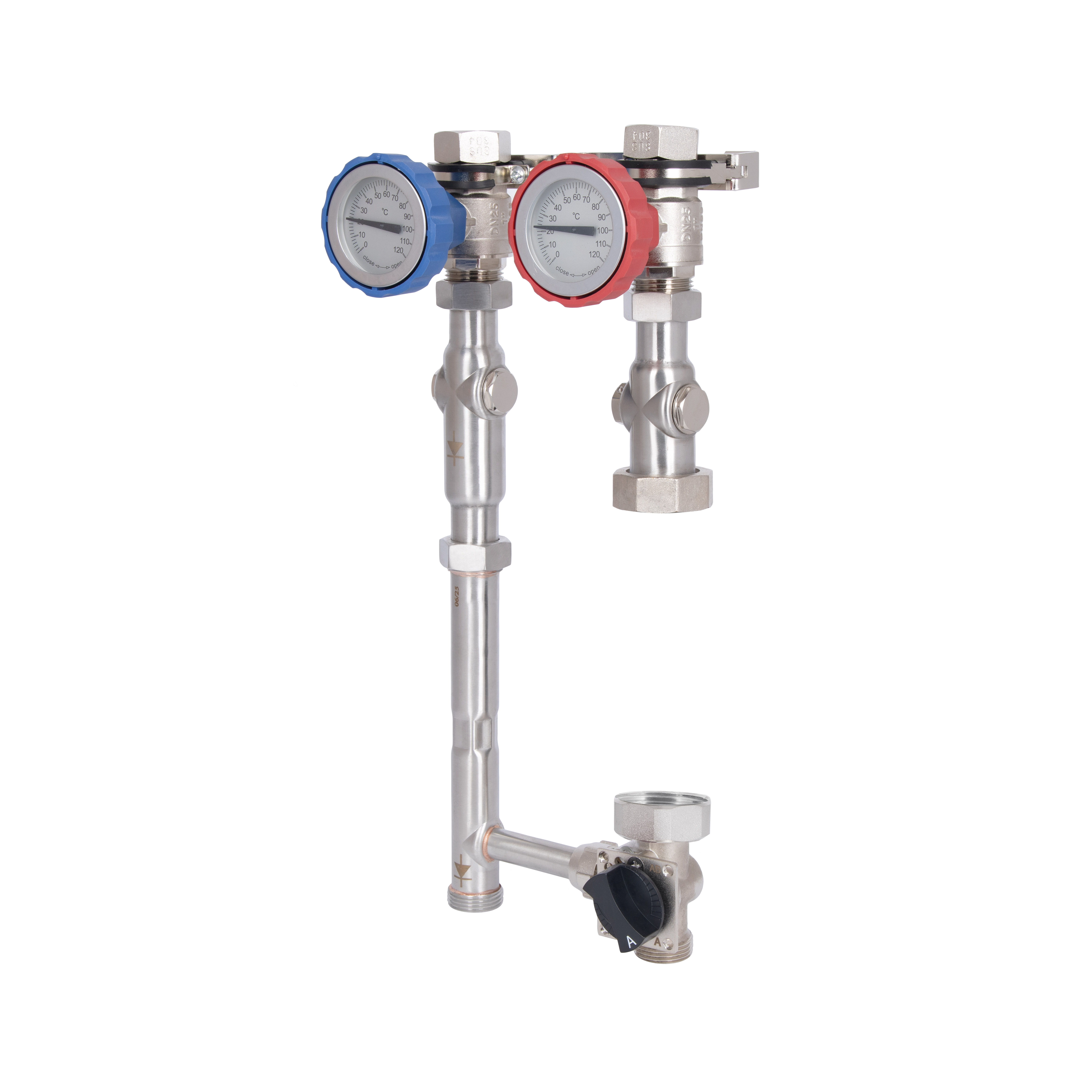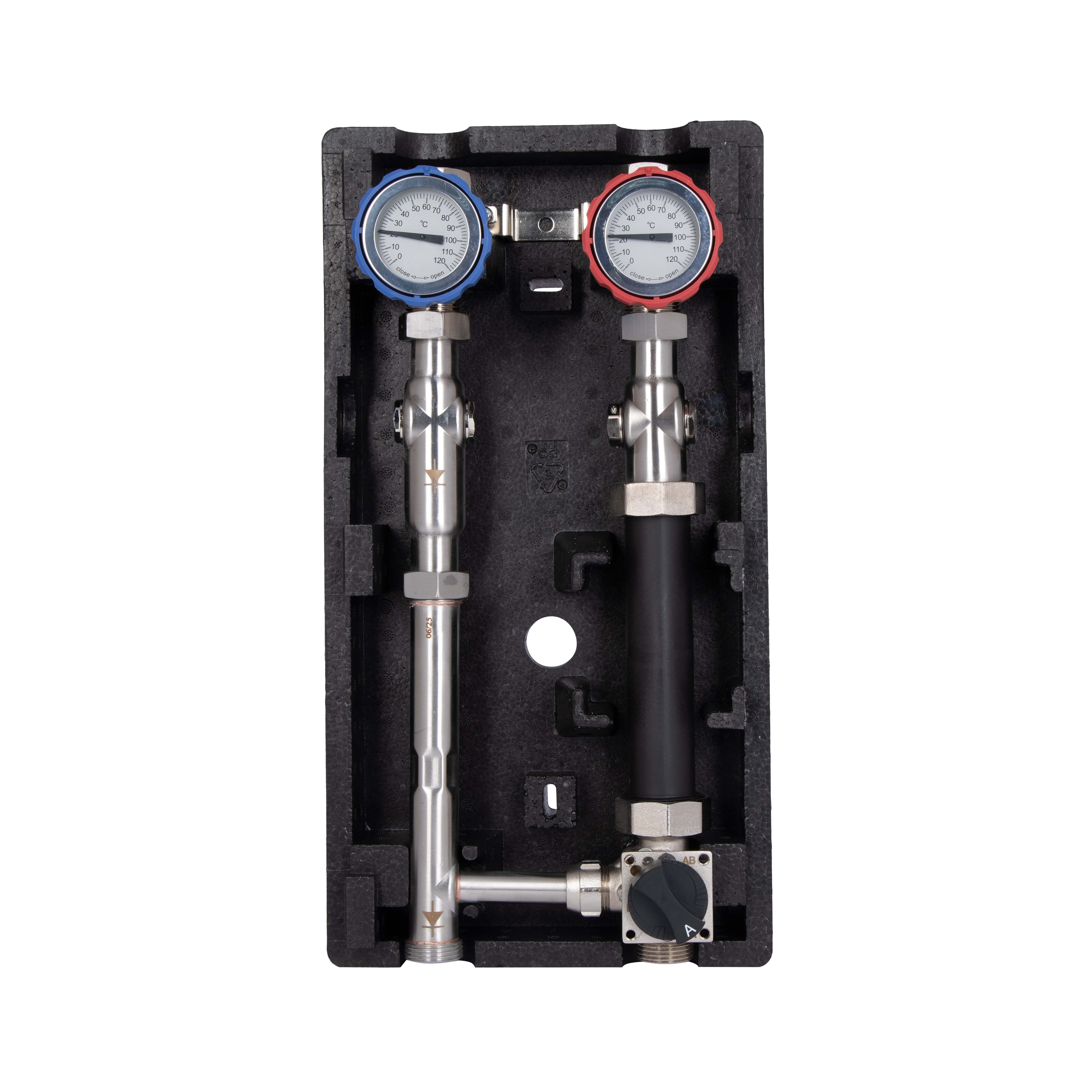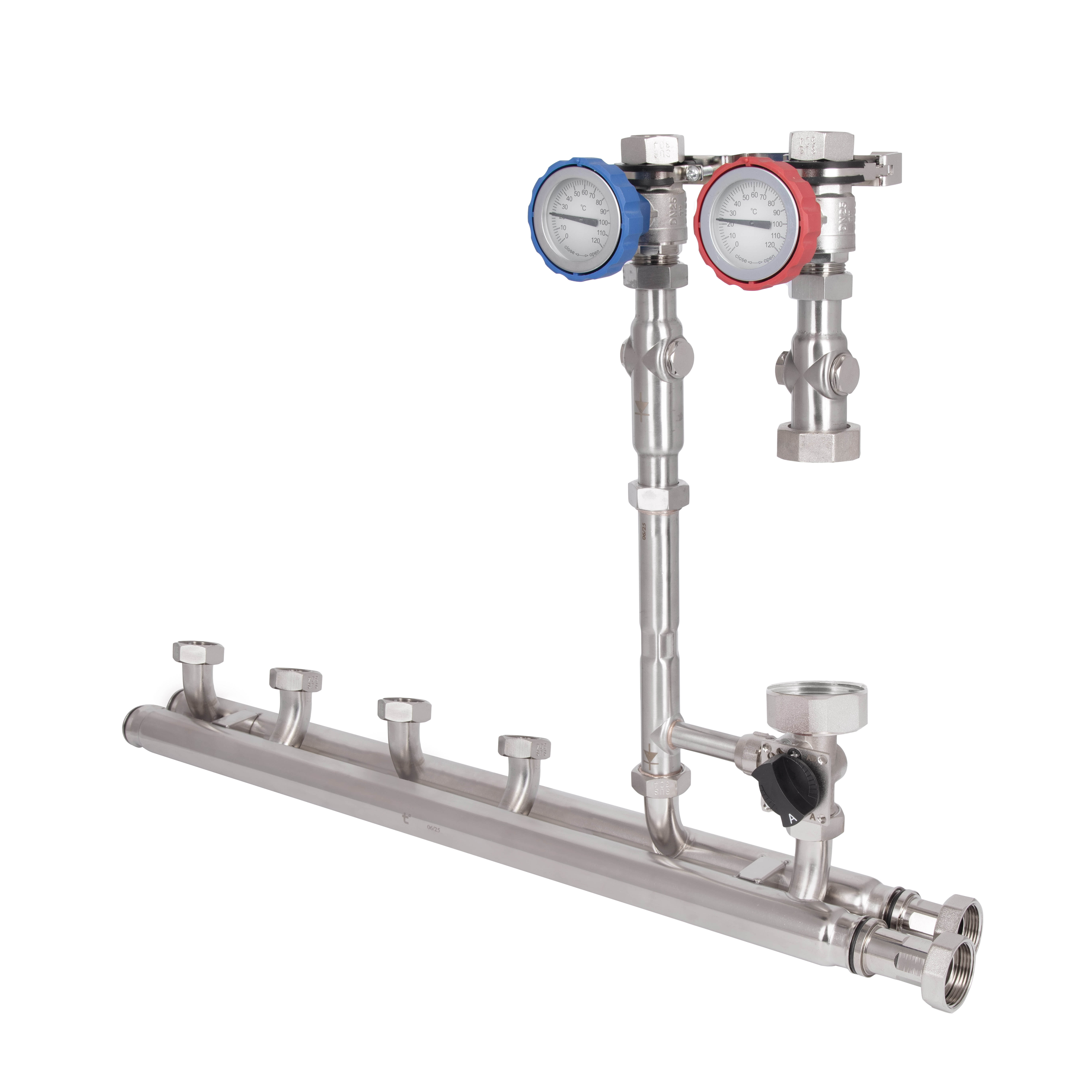 Насосная группа Forte TAF-QSPGR2 оборудована термостатическим смесителем с диапазоном регулировки 25–50 °C, что позволяет поддерживать оптимальную температуру в системе отопления. Изготовлена из нержавеющей стали SUS304, устойчива к износу и коррозии. Подключение — правое, насос не входит в комплект.
