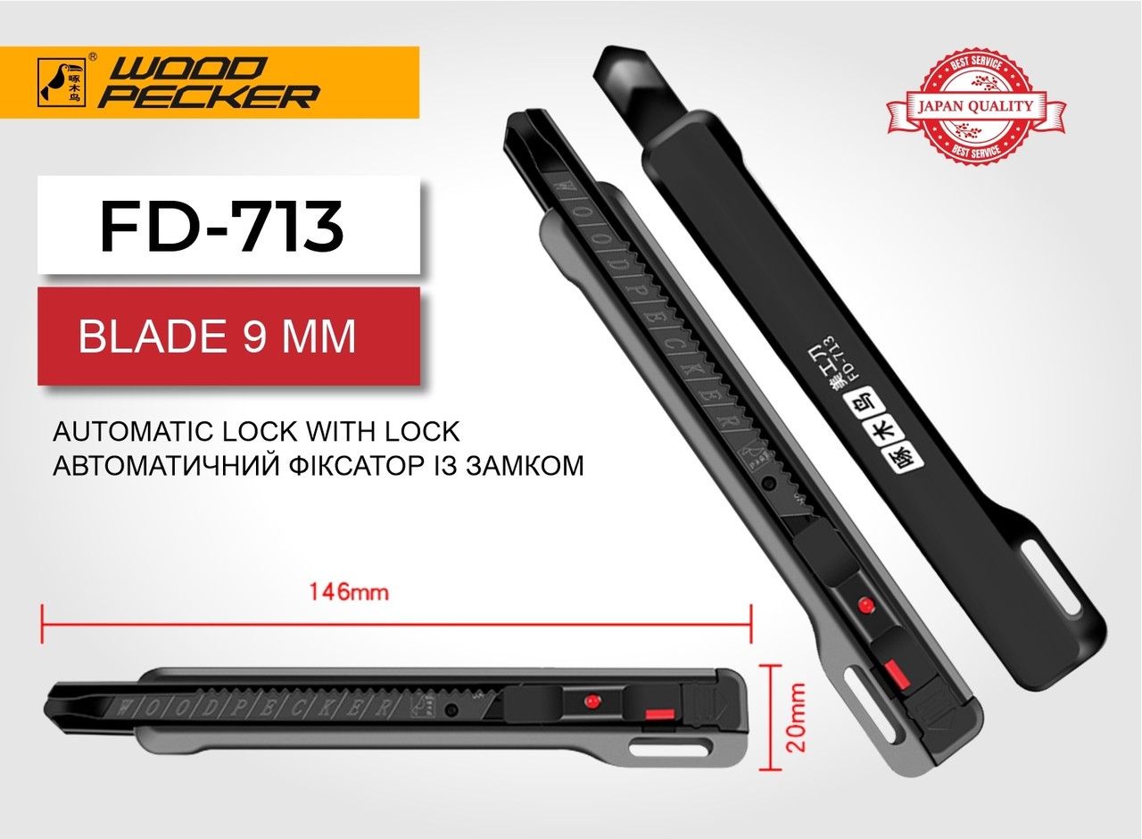 Описание Нож строительный 9мм с автофиксатором и стопором Woodpecker FD-713 код товару FD-713