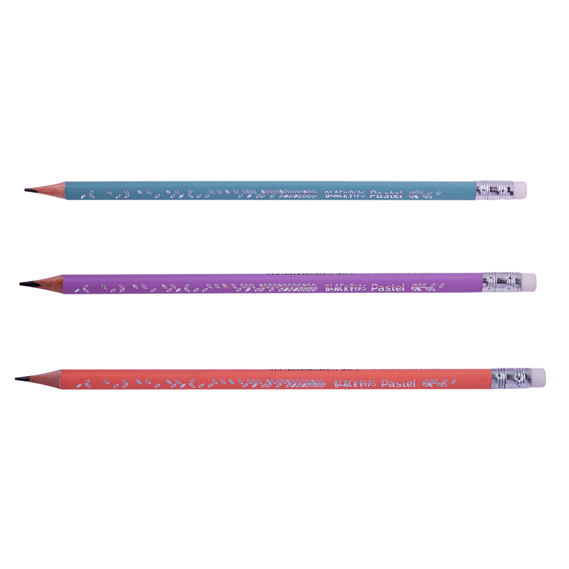 Нові тригранні чорнографітові олівці з гумкою та корпусами у стильних та привабливих пастельних відтінках. Гармонійно доповнює дизайн олівців декоративне тиснення срібною фольгою по всій довжині корпусу.