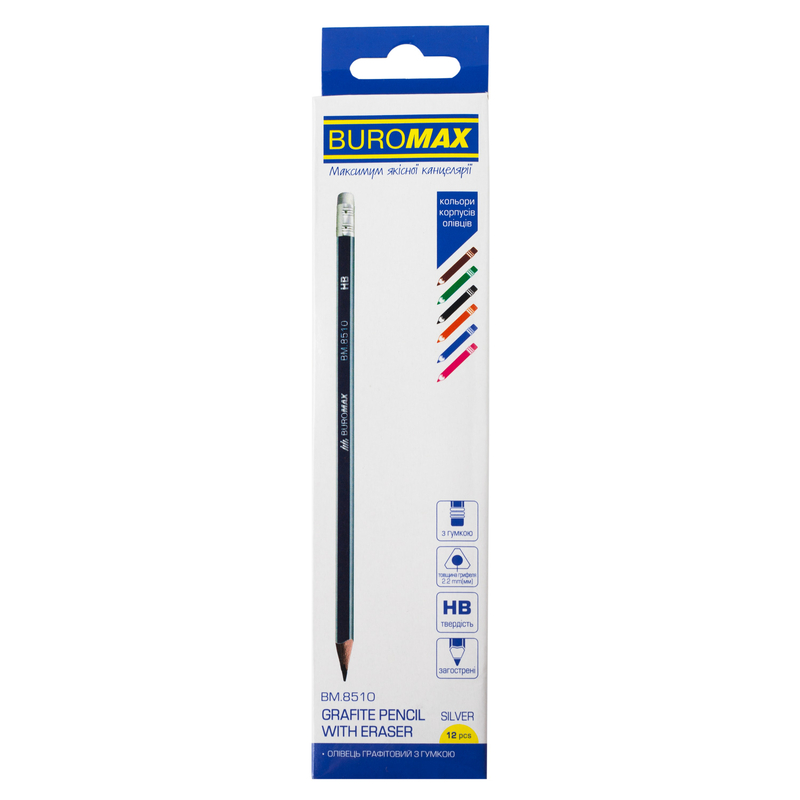 Характеристики Олівець графітовий SILVER, асорті, з гумкою HB (BM.8510) код товару BM.8510