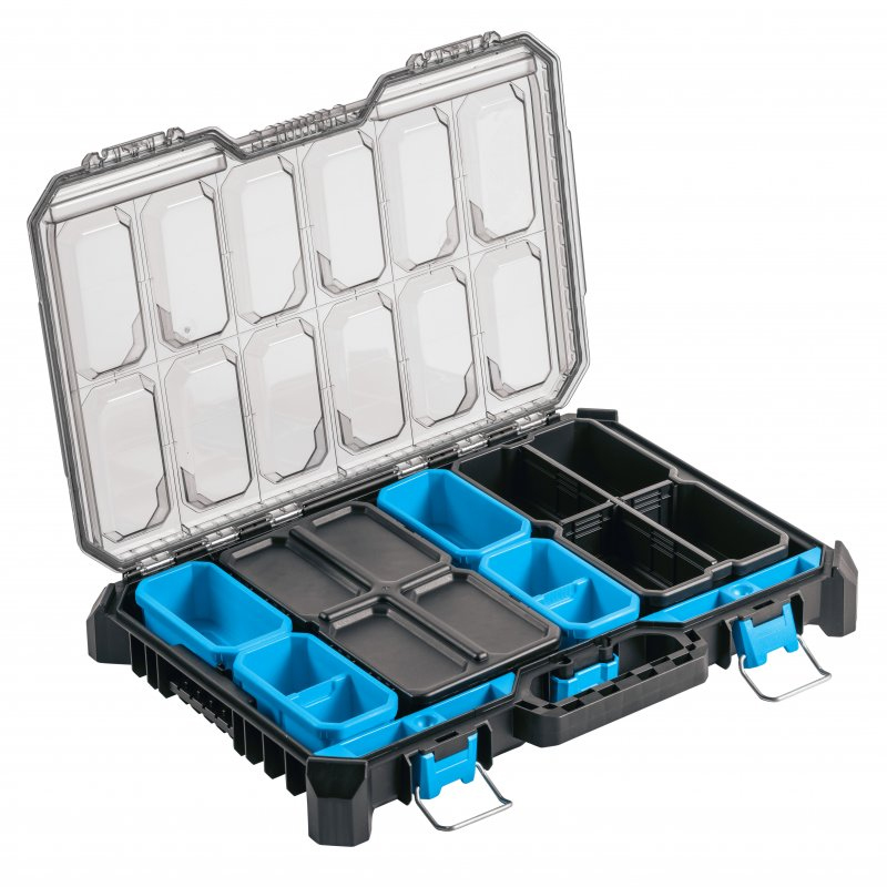 Органайзер з кришкою з полікарбонату використовується для зберігання будівельних і майстерськихінструментів тощо. Створений з думкою про вимогливих користувачів. Він оснащений 5 функціональнимичашками, які дозволяють зберігати невеликі інструменти, аксесуари та інші предмети. Організатор легкокомбінується з іншими компонентами системи модульних ящиків. Міцні застібки та металеві петлі гарантуютьбезпеку при транспортуванні приладдя. Корпус органайзера виготовлений з полімеру. Це гарантує захист відрозливів і пилу. Призначений для професійного використання. Ідеально підходить для використанняв широкому спектрі галузей, таких як будівництво, промисловість, автомобілебудування та логістика.